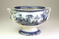 Sopeira, de grandes dimensões, confeccionada em porcelana branca com ornamentação em tom azul. Peça de corpo bojudo, composta por duas alças laterais e base circular. Na parte externa do objeto, duas cenas orientalizadas, tendo, à esquerda, pagode e motivos fitomorfos, além de pátio de duas figuras humanas, uma delas sentada segurando sombrinha e a outra de pé servindo bebida em bandeja. À direita da cena, pedestal com vaso de flores e, ao fundo, pagode e lago. Cena ladeada por duas folhas de parreira em relevo, tendo, na parte superior, frisos azuis com motivos geometrizados. Apresenta alças compostas por dois frisos em meia-cana (cada alça), ornados por traços azuis, que se unem na parte central. Na parte interna do objeto, encontram-se frisos decorados com círculos intercalados por volutas e motivos florais. Base circular com ornamentação em volutas, frisos e motivos geometrizados. Fundo branco com a inscrição “KYBER”, inserida em emblema circular azul, encimado por coroa e cercado por motivos fitomorfos. Na parte superior do emblema, a seguinte legenda: “J. MEIR & SON”, e, na parte inferior: “IRONSTONE”.