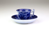 Xícara de café [com pires], de pequenas dimensões, confeccionada em porcelana branca com ornamentação em tom azul cobalto. Apresenta corpo plurifacetado, contendo doze faces, borda com friso simples, alça recortada em curva e arrematada por voluta, e base circular. Ornamentação externa com motivos “chinoiserie”, composta por duas cenas com árvores típicas da região, pagode, lago, ponte e motivos florais. Na parte interna da xícara, barra com volutas e motivos florais intercalada por faixa branca, tendo, ao fundo, ramo de flores. Objeto sem marca. Apresenta pires fundo, ornado à esquerda do campo por cena oriental composta por duas figuras humanas, uma sentada e outra de pé, cercadas por vegetação com árvores, flores e volutas. Na borda do pires, faixa com flores geometrizadas em série. Fundo branco, tendo, ao centro, a seguinte inscrição em tinta azul: “AMOY”, cercada por moldura octogonal com motivos geometrizados, tendo, logo abaixo, outra inscrição com a marca do fabricante: “DAVENPORT”.