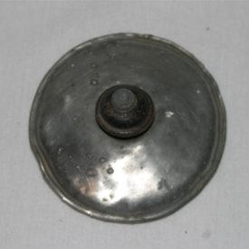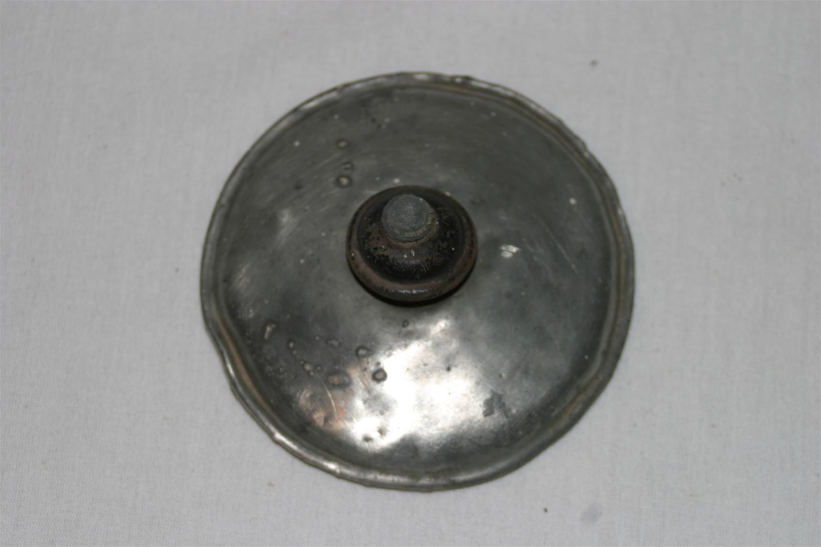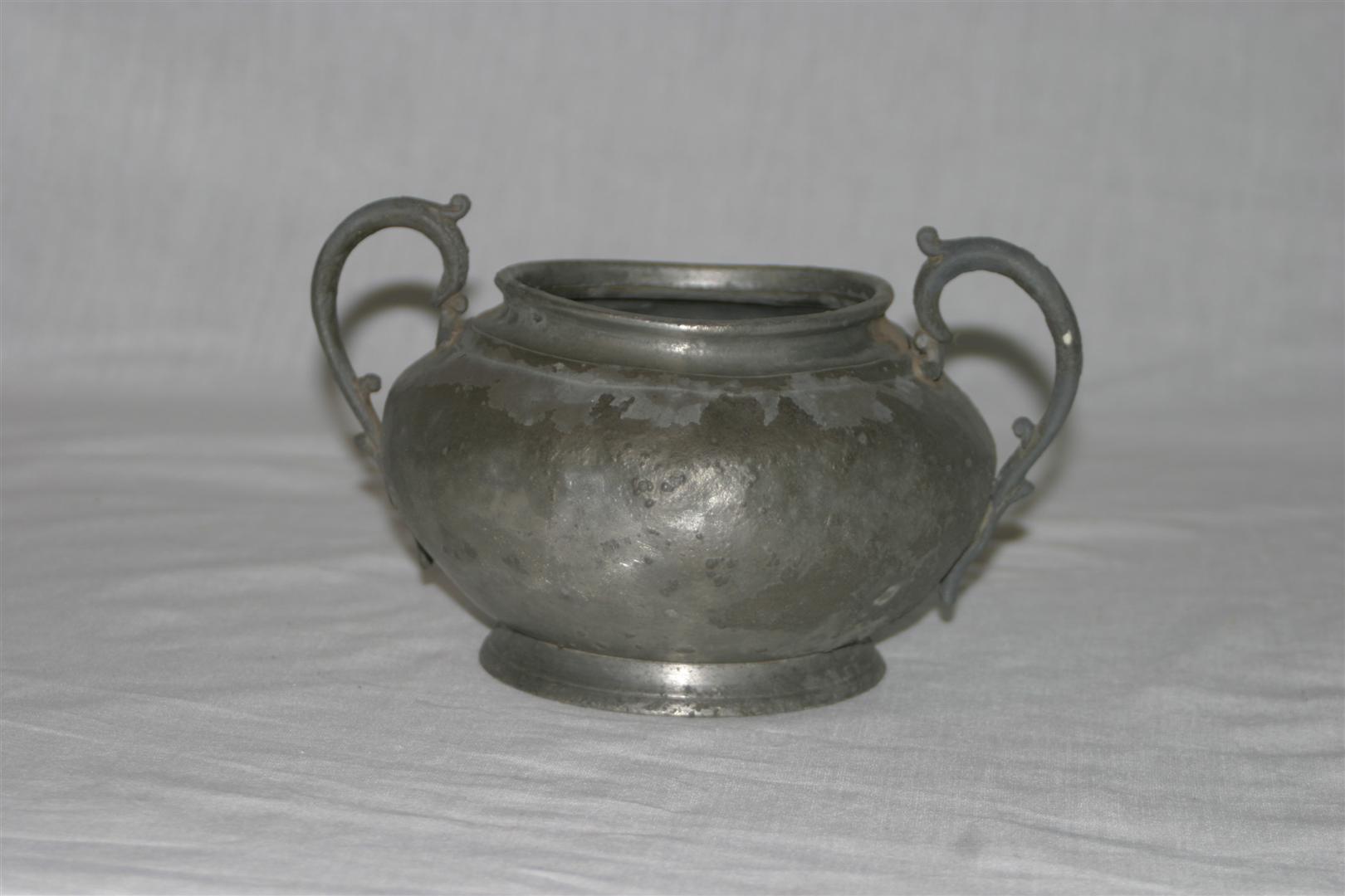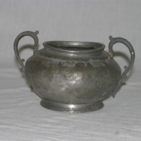 Açucareiro, de dimensão média, confeccionado em metal (estanho), composto por corpo bojudo, duas alças laterais em curva e tampa. Peça de corpo liso e base circular ornada por friso simples. Apresenta alças proeminentes, em formato de volutas, com ornamentação em relevo com motivos fitomorfos. Tampa circular arrematada por pino escalonado de madeira, ornado por flor na extremidade superior. Fundo liso.