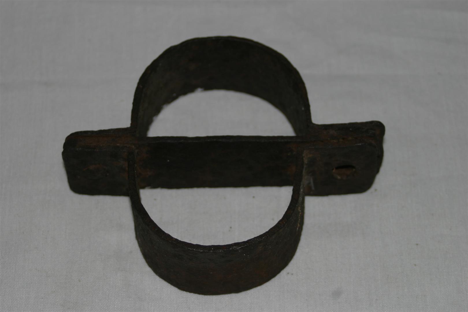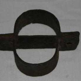 Algema confeccionada em metal (ferro) para prender os pulsos dos escravos. Peça de formato ovalado, composta por três chapas delgadas, uma delas retilínea (posicionada ao centro) intercalando duas outras chapas retorcidas em meio-arco com extremidades recortadas, todas possuindo orifícios para encaixe da fechadura (esta inexistente). As três chapas que compõem o objeto encontram-se unidas numa das extremidades através de parafuso de ferro.