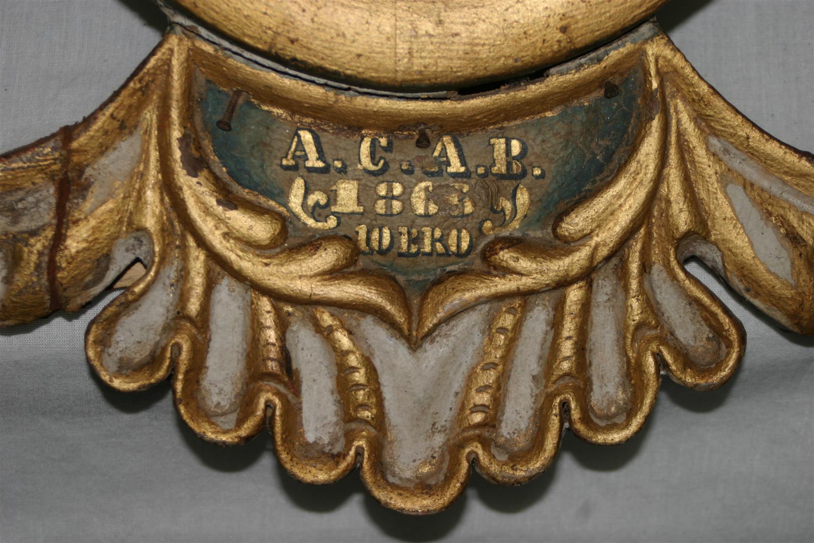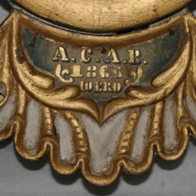 Almofada de bilros confeccionada em madeira clara, algodão e tecido bege estampado com listras e quadriculado. Extremidade do objeto composta por gaveta com puxador torneado. Restante do corpo da peça composto de algodão na parte interna, recoberto por tecido costurado e fixado por pregos na parte que cerca a gaveta. Parte interna da gaveta forrada com papel contendo ornatos circulares em tom bege contornados por traço azul. Apresenta cinco bilros confeccionados em madeira clara, quatro deles com terminação em ponta, tendo, na outra extremidade, estrutura esférica ornada com traços (dois exemplares) e estrutura em espécie de disco liso.