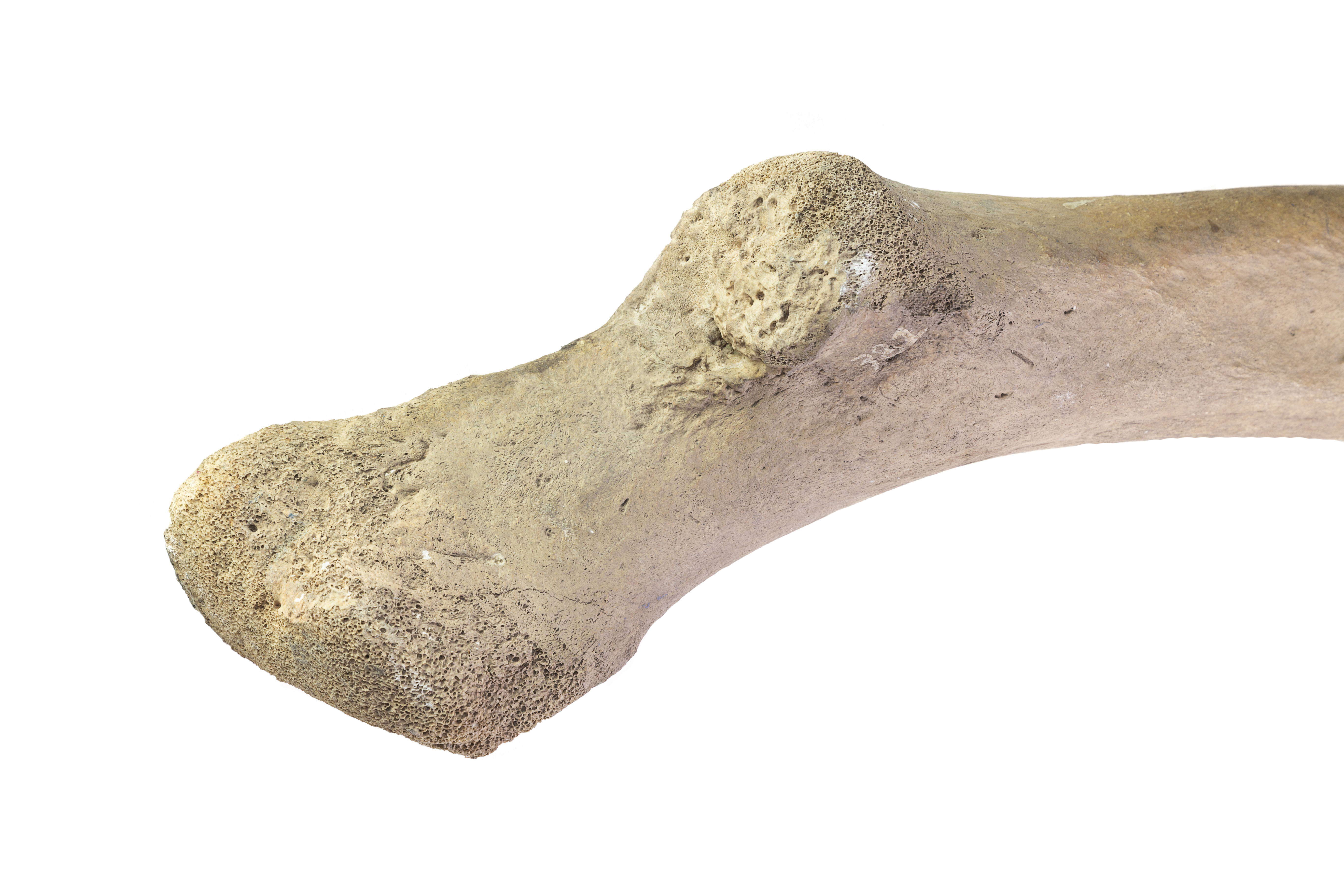 Osso de mastodonte, correspondente à vértebra, em tom acinzentado, em formato de arco, com uma das extremidades mais largas.