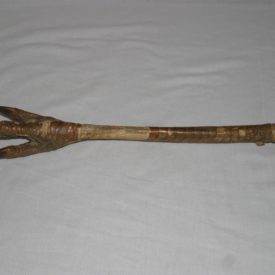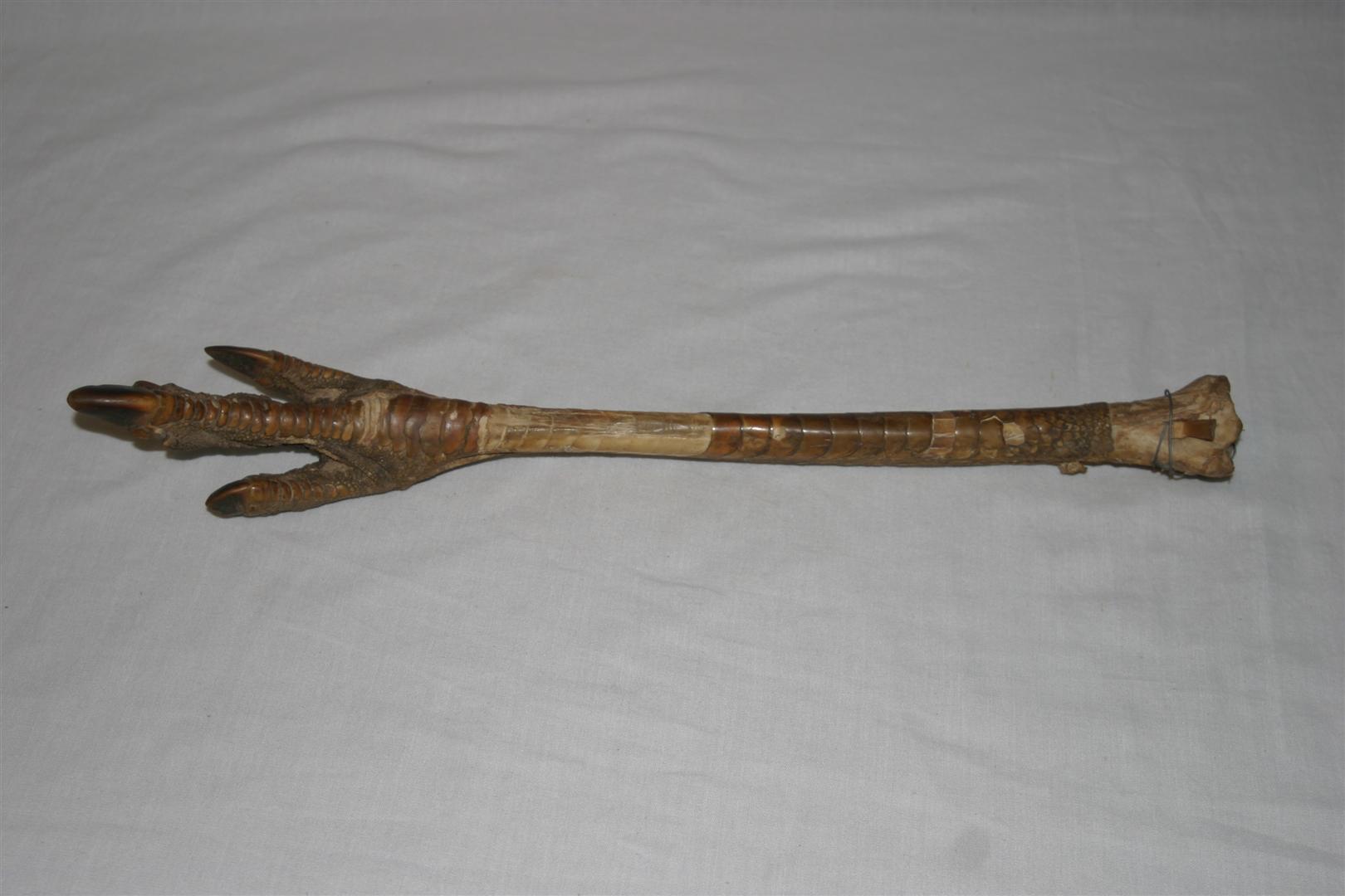 Pé de grande ave (ema), empalhada, de estrutura longilínea e delgada, recoberta por pele em escamas. Apresenta extremidade inferior em estrutura tripartida, de textura granulada, terminada em três unhas pontiagudas na extremidade inferior, nos tons marrom claro e escuro.