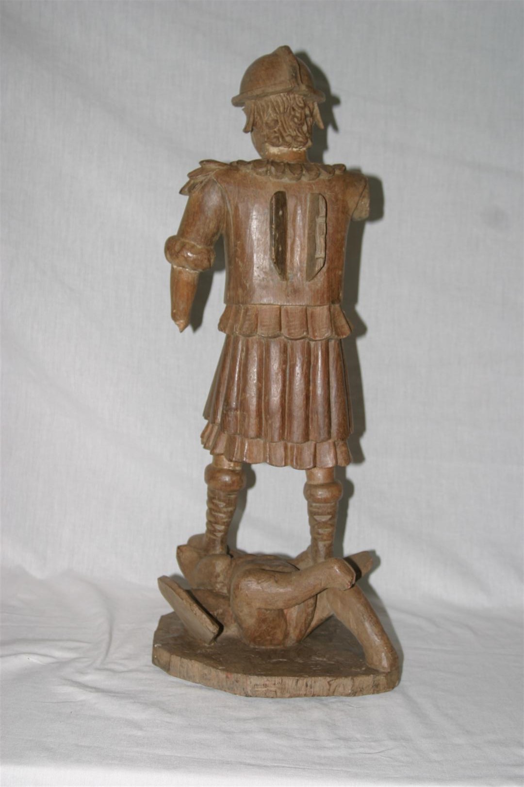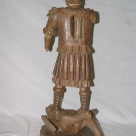 Escultura religiosa, de médio porte, confeccionada em madeira (jacarandá mineiro) entalhada sem policromia, representando São Miguel Arcanjo matando o demônio. Figura masculina, jovem, de pé, em posição frontal, com o rosto levemente voltado para baixo, rosto redondo, testa curta, cabelos curtos, cacheados e com mechas em “C”, orelhas aparentes, olhos amendoados, nariz aquilino, boca pequena e cerrada, e queixo proeminente. Apresenta-se em trajes de guerreiro romano, com capacete e indumentária composta, na parte superior, por camisa com gola em “V” cercada de babados entalhados e com abertura frontal em três botões, e, na parte inferior, por saiote na altura dos joelhos, de caimento duplo, sendo a camada superior entalhada em gomos. Panejamento rígido. Nas costas, destacam-se duas estruturas em madeira com orifícios para encaixe das asas (inexistentes). Pés calçados com botas de cano longo, com dobras em sentido vertical. São Miguel está apoiado sobre demônio, representado através de animal grotesco, deitado de bruços, com rosto agonizante, de boca aberta com a língua para fora. Animal de cabelos estriados, com rosto redondo, orelhas aparentes, patas dianteiras sob os pés do santo, com duas asas e sua perna direita flexionada e em posição mais elevada. Entre as pernas, destaca-se parte do rabo. Imagem apoiada sobre base irregular. Peça com vestígios de bolo armênio.