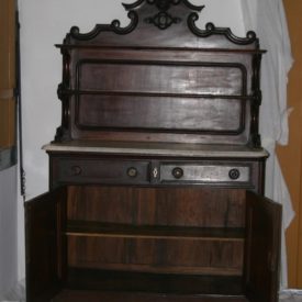 Aparador confeccionado em madeira escura, metal e pedra (mármore), contendo tampo retangular, duas gavetas e duas folhas de porta na parte inferior. Parte superior do móvel composta por prateleira delgada ao centro e com fundo em tábua retangular com friso interno, ladeada por estruturas abauladas e arrematada por frontão ornado por volutas e motivos fitomorfos. Na parte interna do móvel, destacam-se duas prateleiras. Cada gaveta apresenta dois puxadores em argola de metal, tendo entre as gavetas, espelho de fechadura em metal. Cada folha de porta contém um espelho de fechadura em metal.