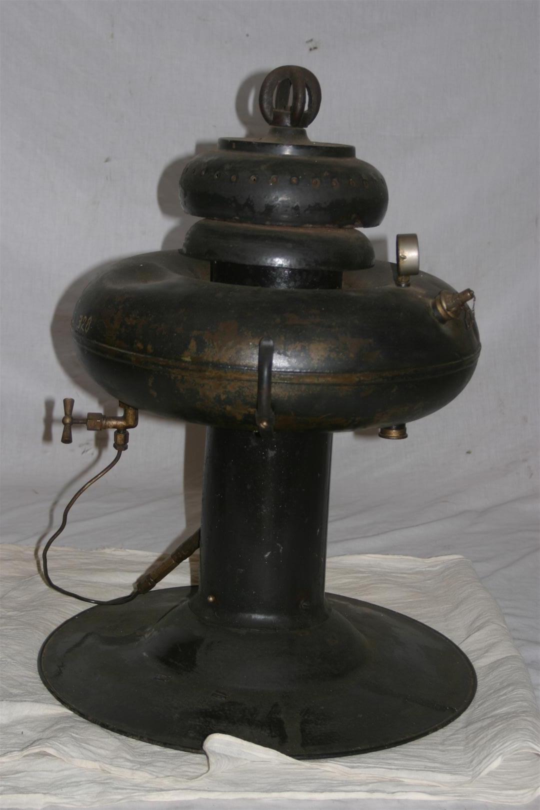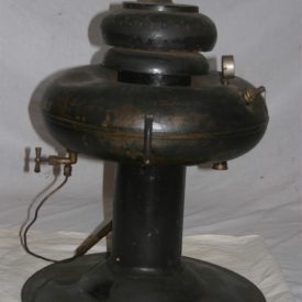 Aparelho de calefação confeccionado em metal (ferro) pintado de preto e vidro. Peça contendo disco com orifícios na parte superior e com gancho de metal retorcido para fixação no teto. Logo abaixo, estrutura cilíndrica em vidro transparente com ornamentação em relevo composta por frisos verticais seriados intercalados por faces lisas. Em uma das faces, a inscrição (parcialmente legível): “...TION/ HEATER”, inserida em moldura oval (vidro quebrado). Vidro apoiado sobre estrutura cilíndrica de metal com ornatos em motivos fitomorfos vazados, contendo uma placa triangular em alumínio, com a inscrição: : “TRADE MARK/ REG. U.S. PAT. OFF/ 1526”. Parte inferior do objeto com pequeno bujão de gás contendo pino circular para regulagem da saída do gás. Bujão coberto por estrutura em metal (ferro), pintada de preto, apoiada sobre quatro pés em chapas abauladas, arrematados por extremidades em ponta que se apóiam sobre prato quadrado.