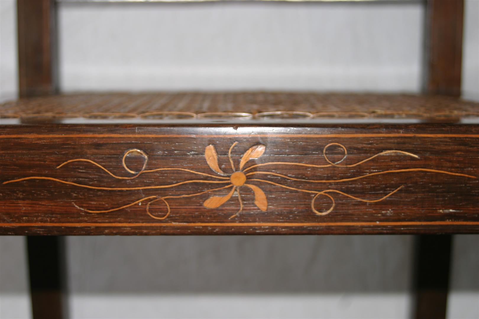 Cadeira confeccionada em madeira (jacarandá), com ornamentação em madeira clara (pau-marfim), na técnica da marchetaria, em estilo D. Maria I, com influência do estilo inglês Sheraton. Objeto com espaldar recortado em formato quadrangular, composto por dois montantes levemente voltados para trás e duas travessas (a superior mais delgada e a inferior mais espessa) dispostas horizontalmente. Apresenta espaldar filetado e ornamentação com flor central (na travessa inferior) ladeada por fios espiralados. Nas extremidades dos montantes, observa-se a mesma padronagem de fios. Assento trapezoidal em palhinha, decorado por filetes duplos, flor e fios espiralados, estes últimos dispostos na parte frontal. Peça sustentada sobre quatro pernas de secção quadrangular. Travejamento quadrado.