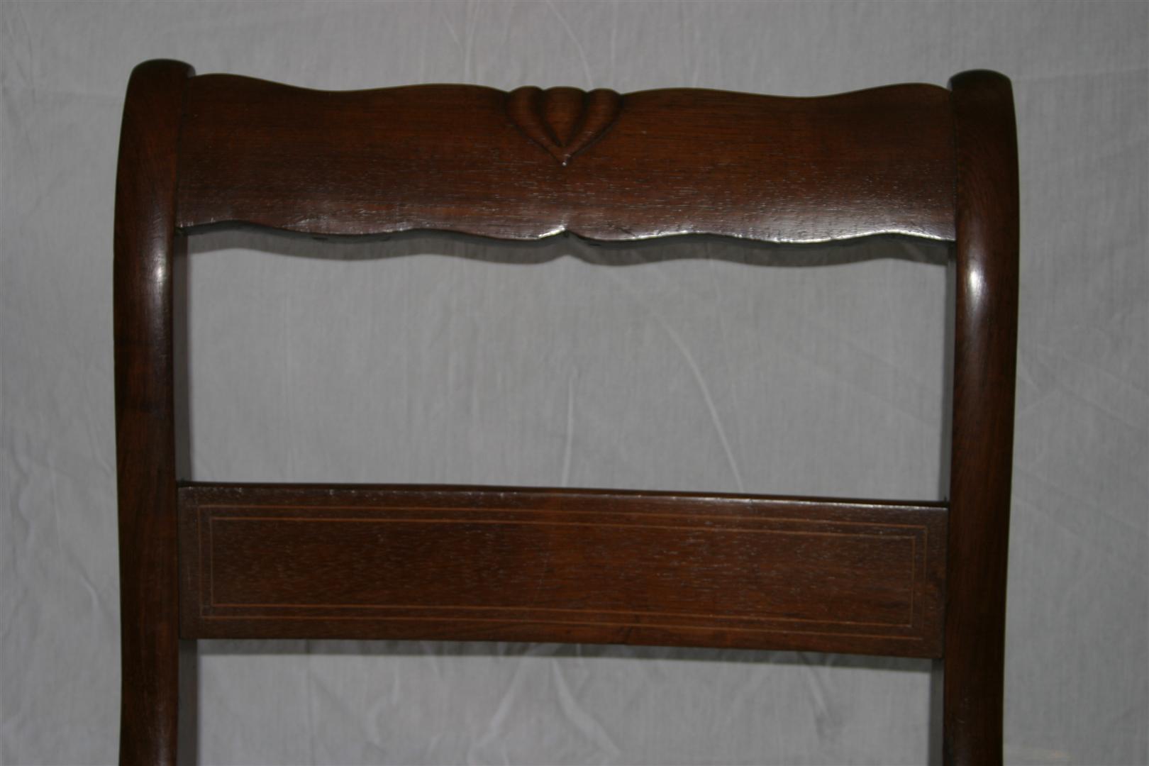 Cadeira de manufatura singela e eclética, confeccionada em madeira (jacarandá), de estrutura retangular e assento quadrangular, em palhinha, com a parte frontal reta. Apresenta encosto dividido em duas traves dispostas horizontalmente, sendo a trave superior recortada em curvas e com ornato central em formato trifoliado, em relevo, e a inferior reta ornada por dupla de filetes em madeira mais clara, de formato retangular. Montantes levemente curvos. Objeto sustentando por quatro pernas de secção quadrangular. Pernas dianteiras arqueadas em sabre e pernas posteriores levemente voltadas para trás. Peça sem amarração.