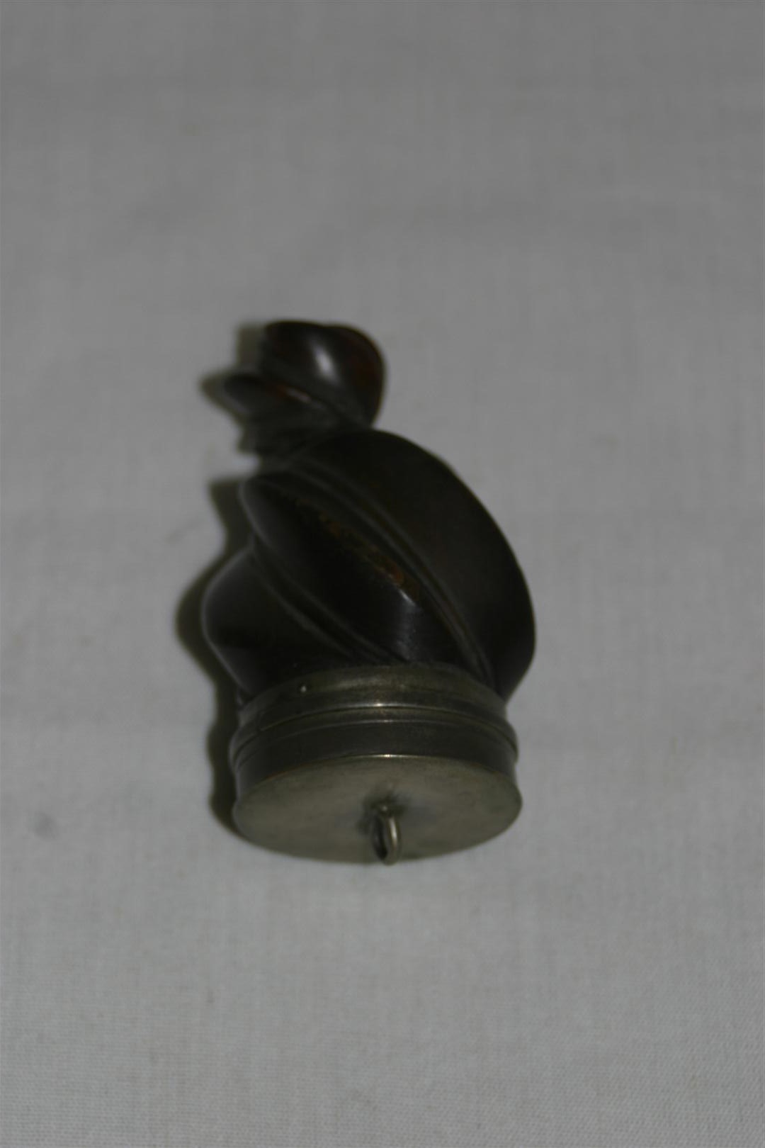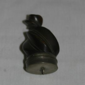 Caixa de rapé, de pequeno porte, confeccionada em madeira (jacarandá) e metal (prata). Apresenta estrutura torneada e facetada arrematada na parte superior por pino com a mesma padronagem decorativa do corpo. Pino cercado por fio metálico. Parte inferior do objeto em metal (prata), de formato circular, ornada por friso simples, tendo abertura em sistema de encaixe e aro na base. Parte interna do objeto oca.