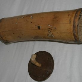 Cantil, confeccionado em bambu (taboca?), de formato cilíndrico ligeiramente abaulado, com tampa circular em madeira escura circundada por parafusos de metal (ferro) e com orifício na parte central para encaixe de pequena estrutura em osso, esta disposta verticalmente e com extremidade em curva. Não apresenta corrente.
