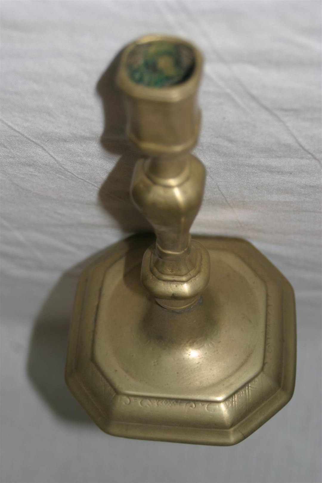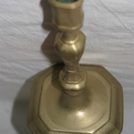 Castiçal confeccionado em metal dourado (latão), com orifício circular (bocal) para encaixe de vela. Parte superior envolta por friso quadrangular e estrutura facetada, ornada por motivos fitomorfos, seguida de estrangulamento. Haste em formato de balaústre com frisos em relevo e estrangulamento inferior e friso em meia-cana. Base octogonal decorada com ornatos gravados (pouco visíveis). Parte interna da base em metal dourado.