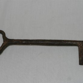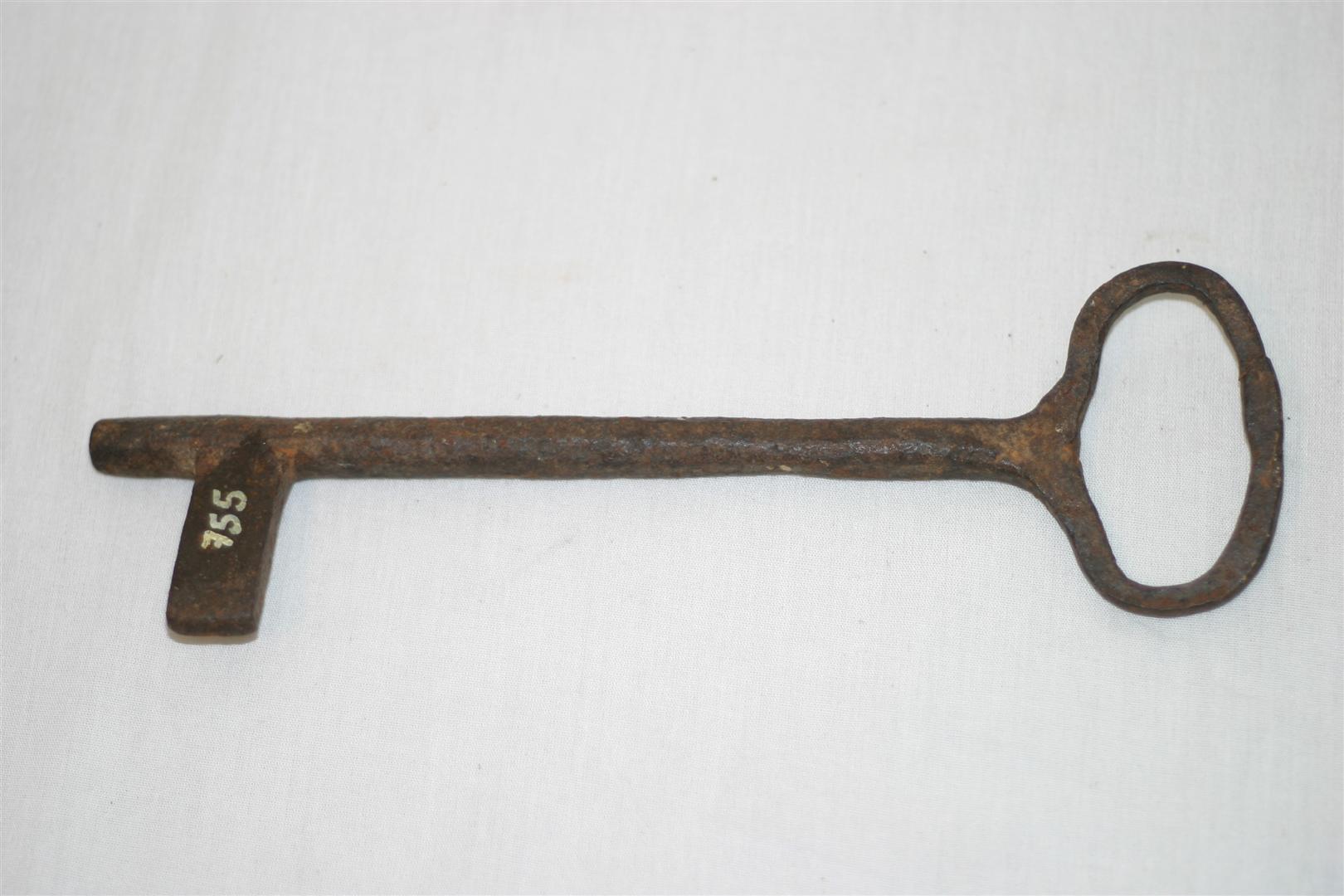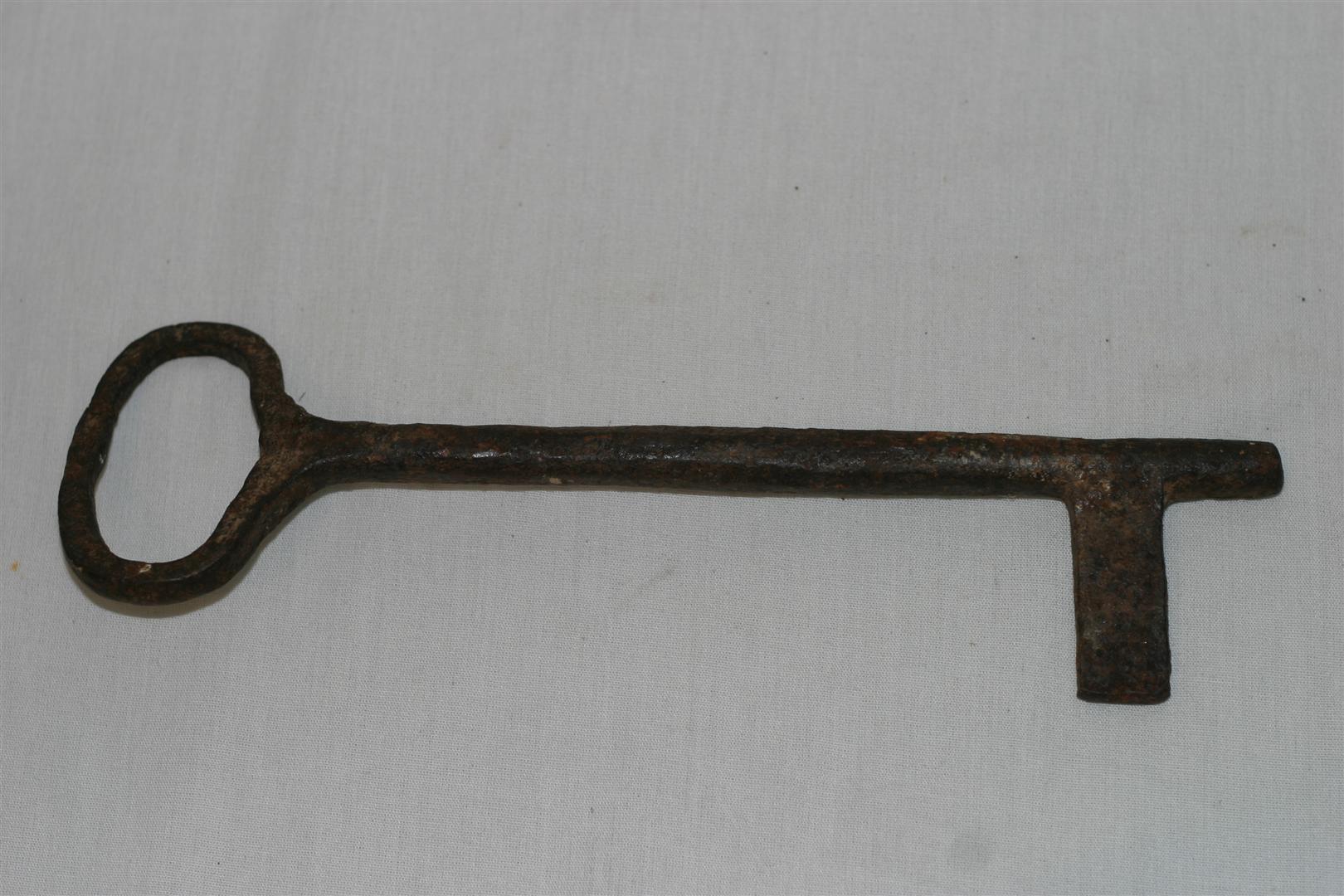 Chave de porta, de grandes dimensões, confeccionada em metal (ferro), de corpo composto por haste cilíndrica delgada e longilínea. Extremidade superior composta por aro ovalado para encaixe da mão. Extremidade inferior com prolongamento lateral de formato retangular para encaixe na fechadura.