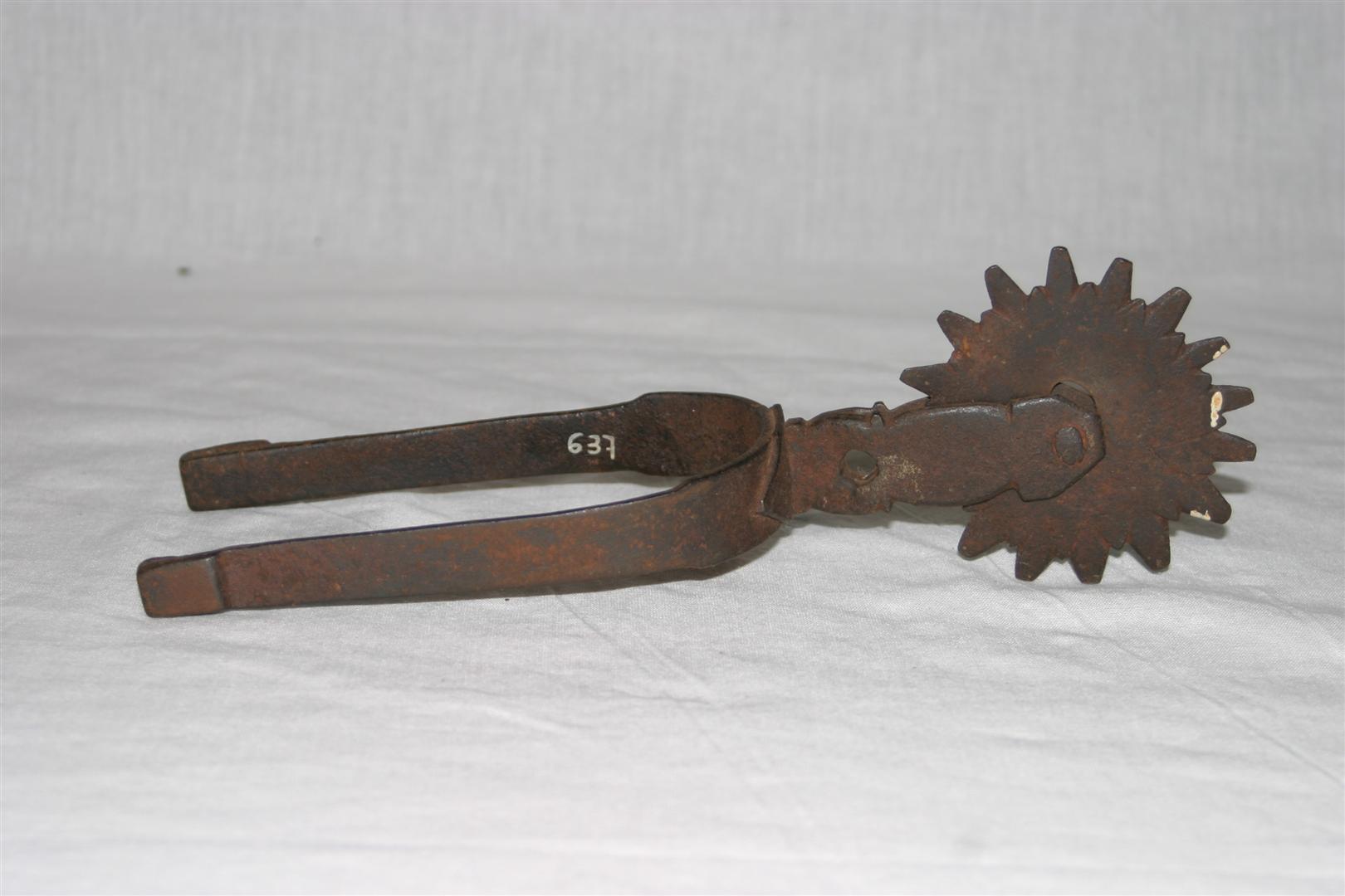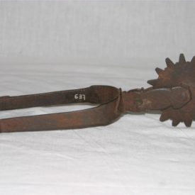 Chilena confeccionada em metal (ferro), apresentando extremidade superior em “U” e com pequenas estruturas laterais para encaixe da correia (esta inexistente). Objeto composto por duas hastes longas arrematadas por estrutura vertical recortada, com orifício na parte superior e com prego na extremidade inferior, de onde sobressai roseta circular denteada (com dezessete dentes).