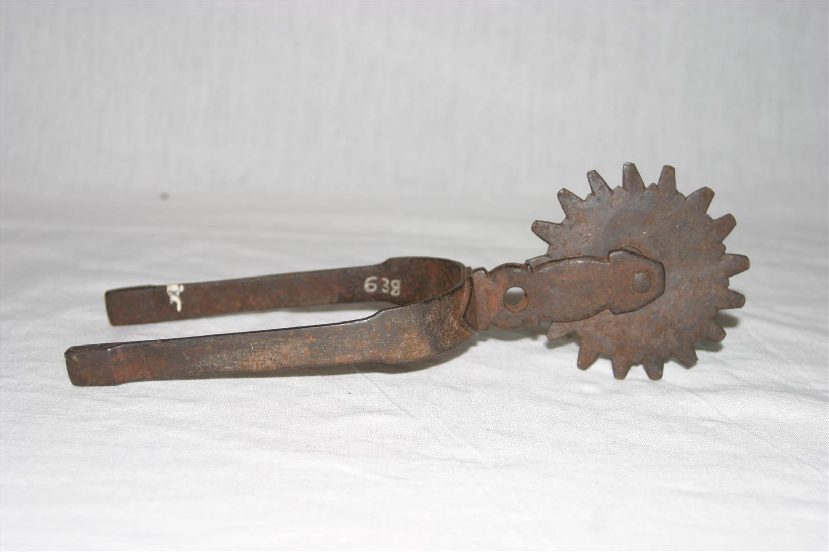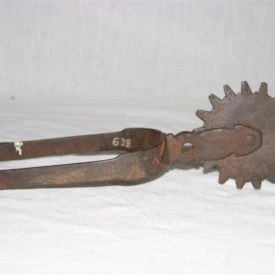 Chilena confeccionada em metal (ferro), apresentando extremidade superior em “U” e com pequenas estruturas laterais para encaixe da correia (esta inexistente). Objeto composto por duas hastes longas arrematadas por estrutura vertical recortada, com orifício na parte superior e com prego na extremidade inferior, de onde sobressai roseta circular denteada (com dezesseis dentes).