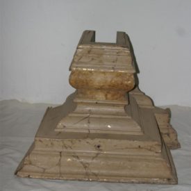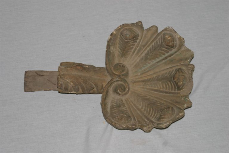 Cimalha em moldura retilínea de formato cúbico com frisos escalonados. (Transcrição de ficha catalográfica de 1994 – feita pela diretora do museu à época, Til Costa Pestana).
