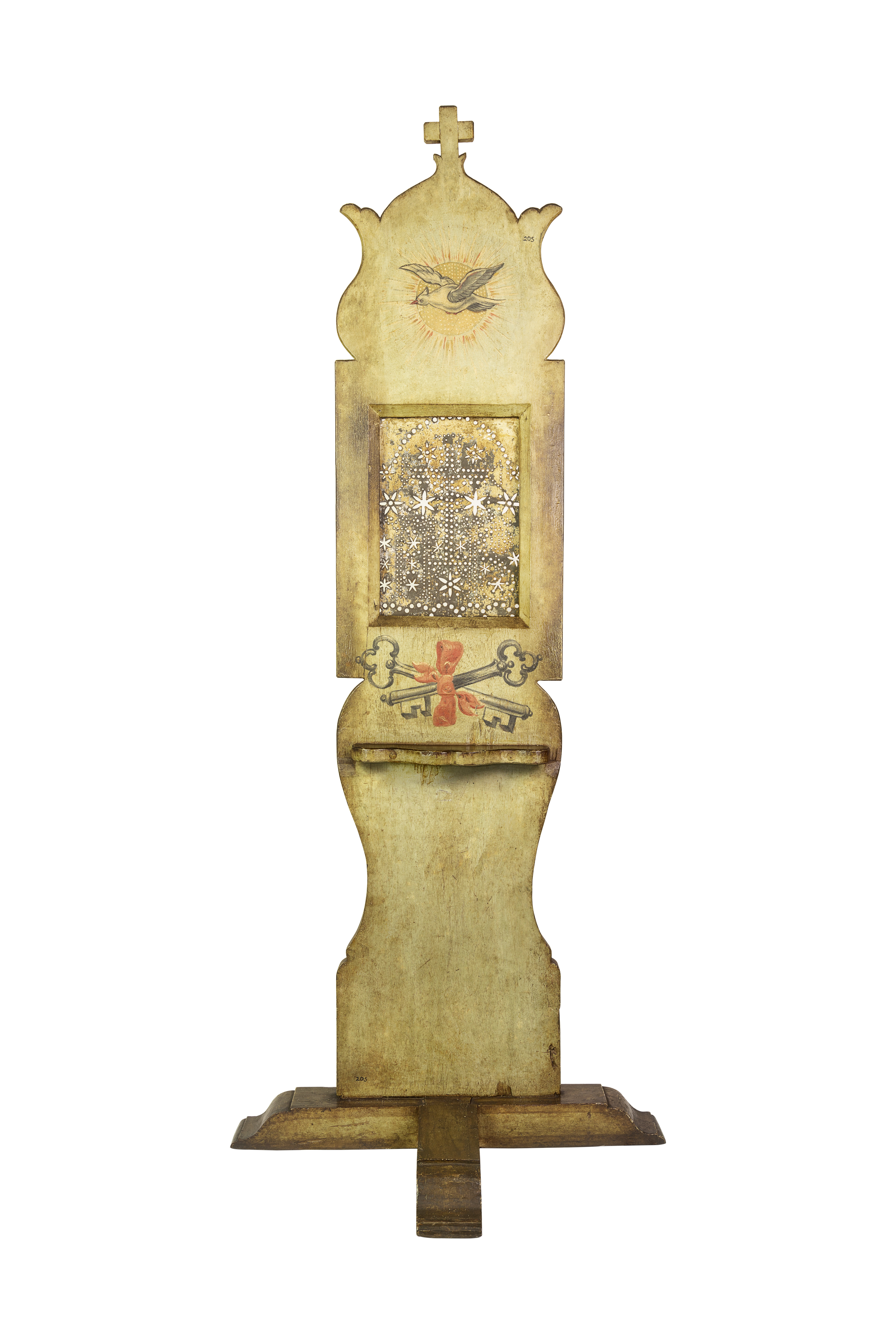 Confessionário, de estrutura verticalizada, confeccionado em madeira recortada e pintada, composto por janela em metal (folha de flandres). Objeto em tábua de madeira, tendo formato de balaústre, a parte central retangular e as extremidades com laterais em curva. Parte frontal do objeto encimada por cruz latina, tendo, logo abaixo, representação dos símbolos do martírio de Cristo pintados: três cravos pretos cruzados na extremidade inferior, entrelaçados por coroa de espinhos em tom verde escuro e circundados por sol com raios brancos e vermelhos. Peça pintada em tom azul claro ornada por friso branco (escurecido). Na parte central do objeto, janela em placa retangular de folha de flandres, com ornamentação vazada em estrelas e círculos, estes últimos compondo desenho de cruz latina (ao centro) e as letras “IHS” (em posição invertida). “Parte inferior com caveira e ossos pintados em tom marrom sobre piso em tom verde escuro. Peça apoiada sobre base em tripé escalonado. Parte posterior do objeto com representação da pomba do Divino Espírito Santo, pintada em branco e cinza, com bico vermelho, voando e tendo ao fundo sol amarelo com ornamentação em pontilhado branco e raios em tons vermelho, amarelo e branco. Na parte central, abaixo da tela em metal, chaves cruzadas pintadas em tom preto e amarradas por laço vermelho. Sob as chaves, estrutura de madeira com recorte sinuoso para apoio dos braços do confessor.” A procedência e forma de aquisição devem ser pesquisadas na documentação, já que há informações que a peça é procedente da Igreja do Carmo e da Antiga Igreja da Sé, de Diamantina. Em fichas anteriores, a peça consta como doada, mas a mesma surge no inventário de 1952 como comprada do Sr. Coimbra. (pesquisar posteriormente). Documentação encontrada no dossiê: 1) Ficha cadastral do Ministério da Educação e Cultura, datilografada e assinada pelo informante e pelo dirigente do órgão, Anto- nio Eugenio Nascimento e João Brandão Costa (respectivamente), datada de 06/12/1970. 2) Ficha cadastral do Ministério da Educação e Cultura, datilografada, com o nome do funcionário informante Sr. Antonio Eugenio Nascimento, datada de 11/11/1974. 3) Ficha amarela de fichário, que cita: “1 Confessionário de madeira pintado com 165x37 proc. da Igreja de N.S. do Carmo”, com foto preto-e-branca. Ficha datilografada do MEC/IPHAN, referente ao inventário de 1981, sem assinatura, com foto preto-e-branca. 5) Ficha de Catalogação de Acervo Museológico, registrada por Tânia Bravo Leite (1989) e revisada pela museóloga do Museu da Inconfidência, Celina Santos Barboza, em 1990 (ficha datilografada). 6) Ficha de Acervo Museológico GMCH/MG, em formato de fichário, assinada por Tânia Bravo Leite e por Celina Santos Barboza (1989/1990), com foto preto-e-branca. 7) Foto preto-e-branca (pequena). 8) Ficha do IPHAN/ 13ª Coordenação Regional, assinada por Ronney Leite Brito, referente à Análise do Estado de Conservação do Acervo/ Museus Vinculados 13ª CR, datada de 17/01/1996.