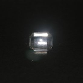 Cristal de rocha, transparente, hialino (com aparência de vidro), identificado como quartzo. Peça de formato octogonal, lapidada com facetado do tipo “mesa”.