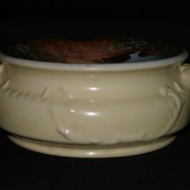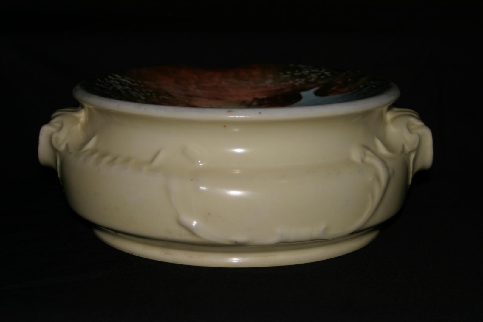 Escarradeira de formato circular, confeccionada em porcelana pintada em tom amarelo claro (creme) e ornada na superfície por cena campestre. Peça de corpo bojudo, com aberturas laterais vazadas e terminadas em bico, tendo volutas e ramagens em relevo. Superfície composta por prato circular com friso branco e orifício central, apresentando em seu entorno cena com representação de figura feminina, disposta à direita, sentada sobre tora de madeira, de cabelos ruivos cobertos por chapéu, tendo o rosto inclinado à esquerda e as pernas cruzadas, tocando instrumento de corda. Traja vestido de mangas curtas, com corpete em tom rosado, saia em tom azul e pés calçados com sapatos de salto. Figura cercada por árvore de tronco delgado, relva com folhagens brancas, terra e pedras. À esquerda da cena, lago com embarcações a vela e, em segundo plano, paisagem montanhosa e céu azulado. Fundo do objeto em formato circular em porcelana branca lisa, com a marca em tom verde: “B.R&L (sublinhada)/ LIMOGES/ FRANCE”.