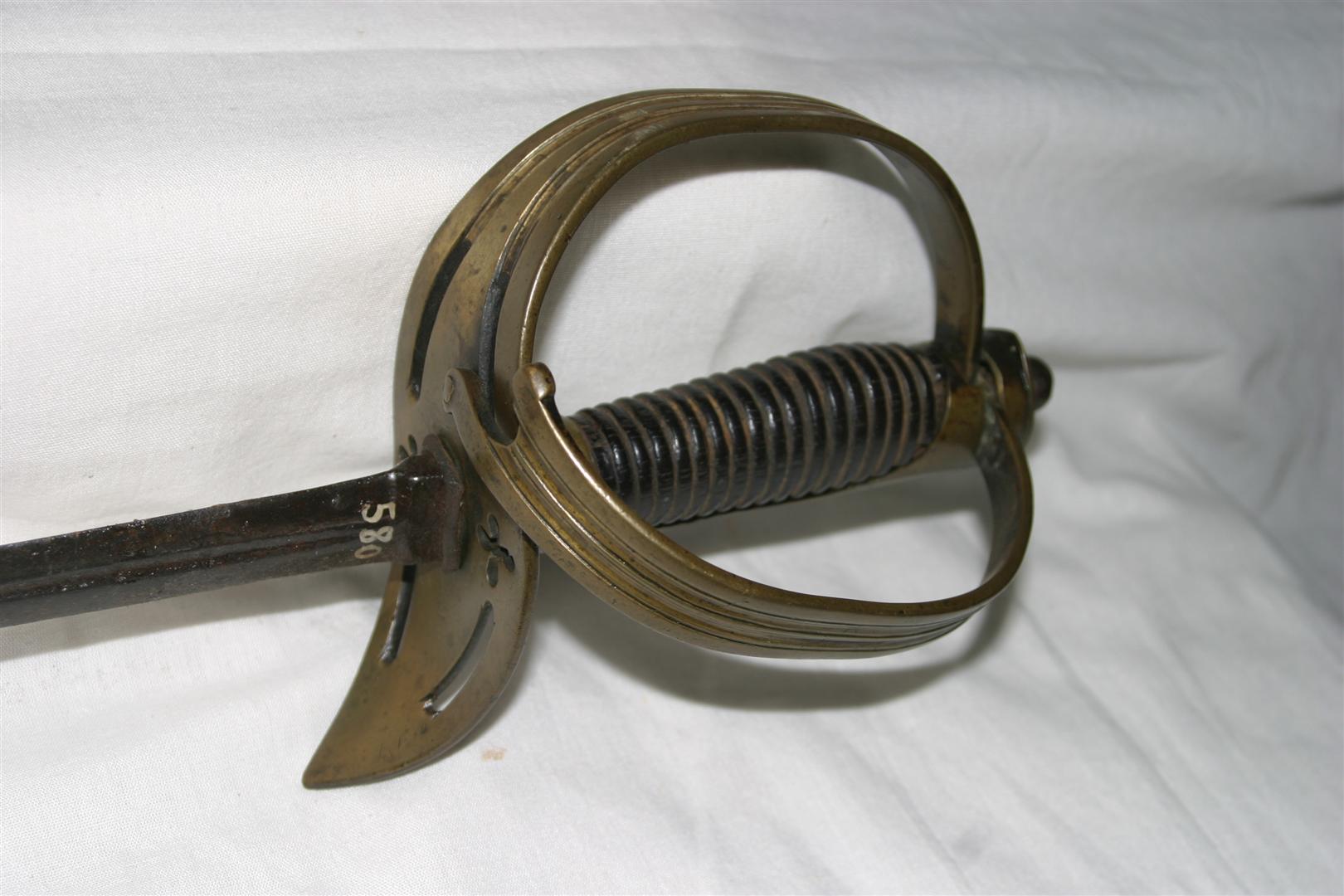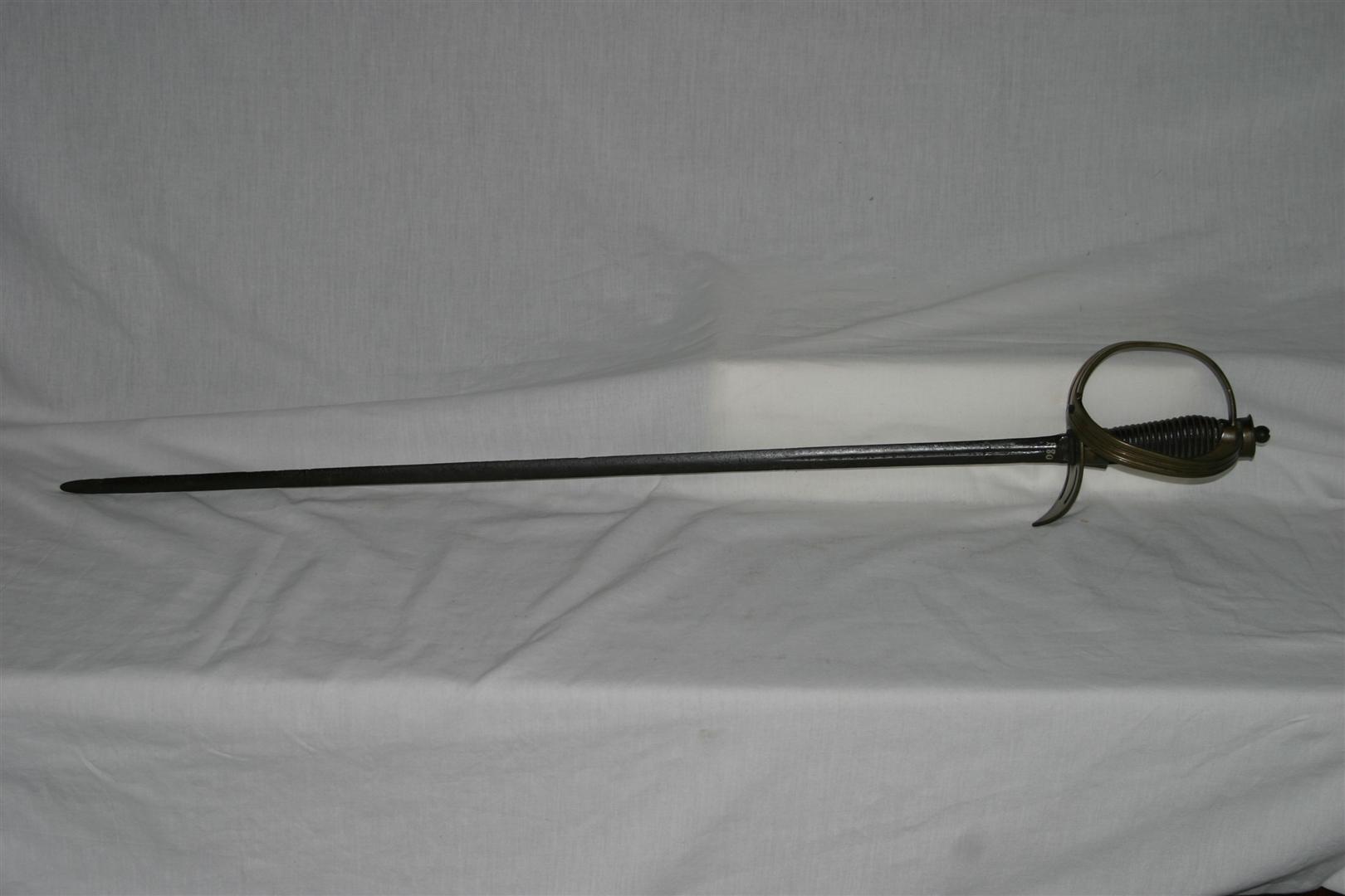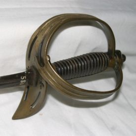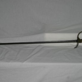 Espada confeccionada em metal e madeira, de origem alemã. Apresenta lâmina em ferro, de ponta abaulada, contendo a seguinte inscrição gravada: “IN XX SOLINGEN XX” e globo crucífero, ambos dispostos nas duas faces da lâmina, próximo ao punho. Punho confeccionado em metal (latão), de linhas sinuosas, arrematado por estrutura em ponta e com ornamentação vazada composta por dois florões e quatro elipses. Parte externa da lâmina decorada com frisos. Estrutura interna do punho em madeira estriada, arrematada por esfera de ferro.