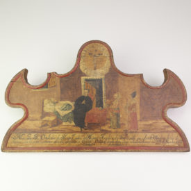 Sobre Ex-voto: “Testemunho por meio do qual um devoto manifesta gratidão à divindade, ou a um santo, por uma graça especial, mística ou mágica do autor do milagre. Esse testemunho apresenta-se: a) como representação iconográfica (geralmente pintura) da graça obtida e envolve a natureza do milagre (iminência de morte ou destruição, enfermidade ou perigo), o agraciado e o santo; (...) A tradição cultural portuguesa transplantou-se para o Brasil e com ela as práticas do catolicismo ortodoxo ou popular, ergueram-se ermidas, capelas, igrejas, santuários, e as “salas dos milagres” se povoaram de peças esculpidas e de “quadros”. No séc. XVIII, estes eram executados à maneira portuguesa, sobretudo no litoral e em Minas Gerais; eram pinturas em geral primitivas que, embora reproduzissem o ambiente colonial, refletiam a tradição lusa. Mas a grande maioria dos ex-votos se concentra no séc. XIX e tem características bem brasileiras: os temas rurais ou urbanos são documentos ricos em informações; abrangem todas as classes – da aristocracia aos escravos – as práticas da medicina e os enfermos, a arquitetura, a indumentária, a flora e a fauna; representam cenas de agressões de animais, naufrágios, acidentes com carros ou queda de cavalo, incêndios, ataques de inimigos. Nos ex-votos de influência portuguesa o quadro se apresenta em dois planos: o do milagre propriamente dito com a legenda (comum ou em cartela); e do agente sobrenatural envolto num círculo de nuvens, ou entrando por portas e janelas ou, ainda, sob a forma da imagem tal como figura no altar de devoção (nas cenas de doenças o crucifixo ou a imagem do santo aparece na parede sobre a cama do doente).” (1) Foto do ex-voto com a seguinte legenda: “22. No Tejuco, Rita Angélica da Costa pediu ajuda a Nosso Senhor/ do Matosinhos; depois de oito dias de parto, cm a criança já morta/ no ventre, deu finalmente à luz. O ex-voto, de 1781, diz: “Milagre que/ fez o Senhor do Matozinho a Rita Angélica da Costa, estando de parto/ com a criança morta no ventre oito dias a 14 de dezembro e botou/ a 22 do mesmo mês em o ano de 1781”. (2)