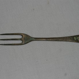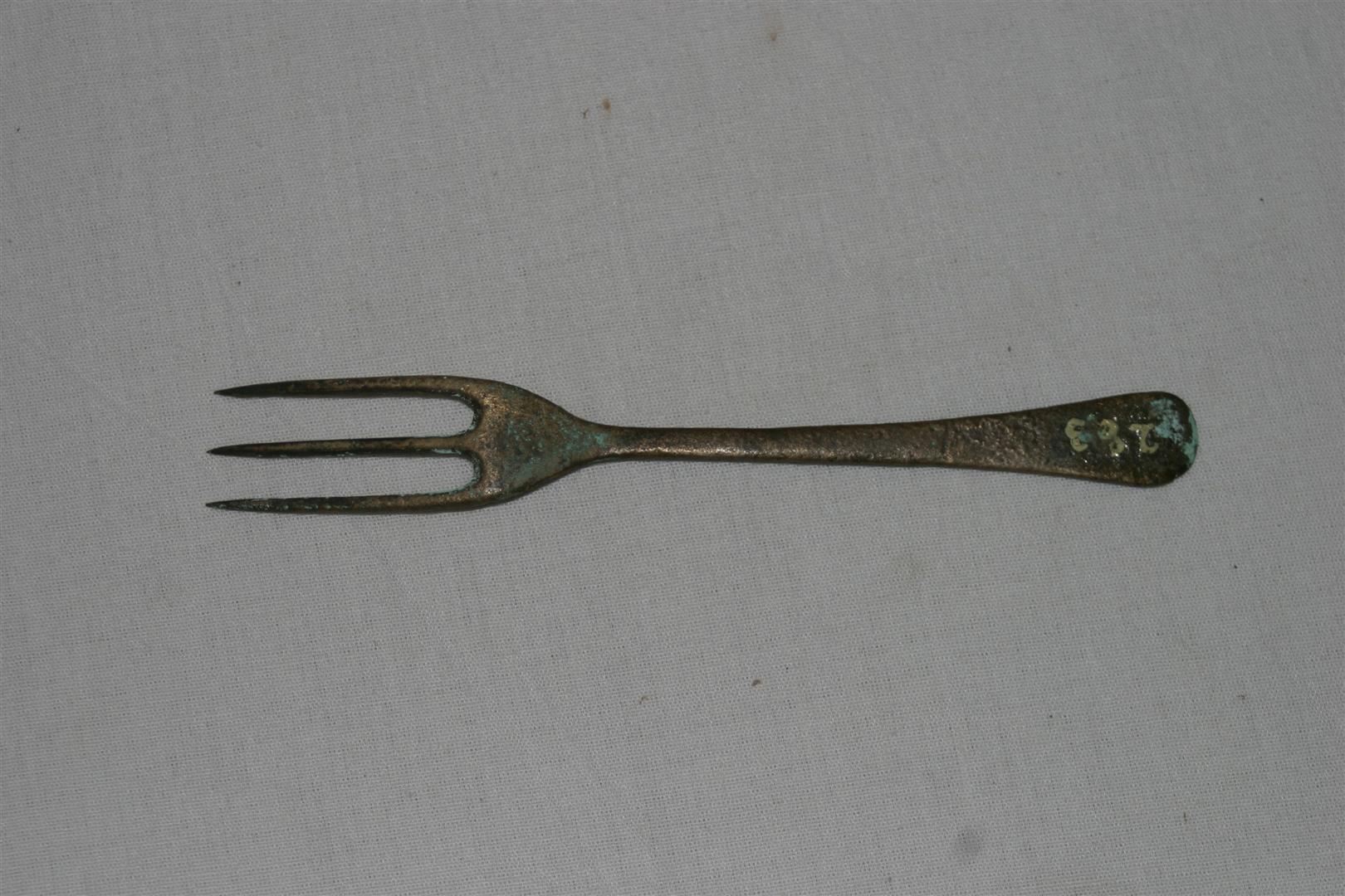 Garfo de peixe confeccionado em metal amarelo (latão?), tendo extremidade superior composta por três dentes pontiagudos. Objeto de estrutura longilínea chapada, contendo cabo mais espesso e ligeiramente elevado na extremidade. Extremidade do cabo abaulada.
