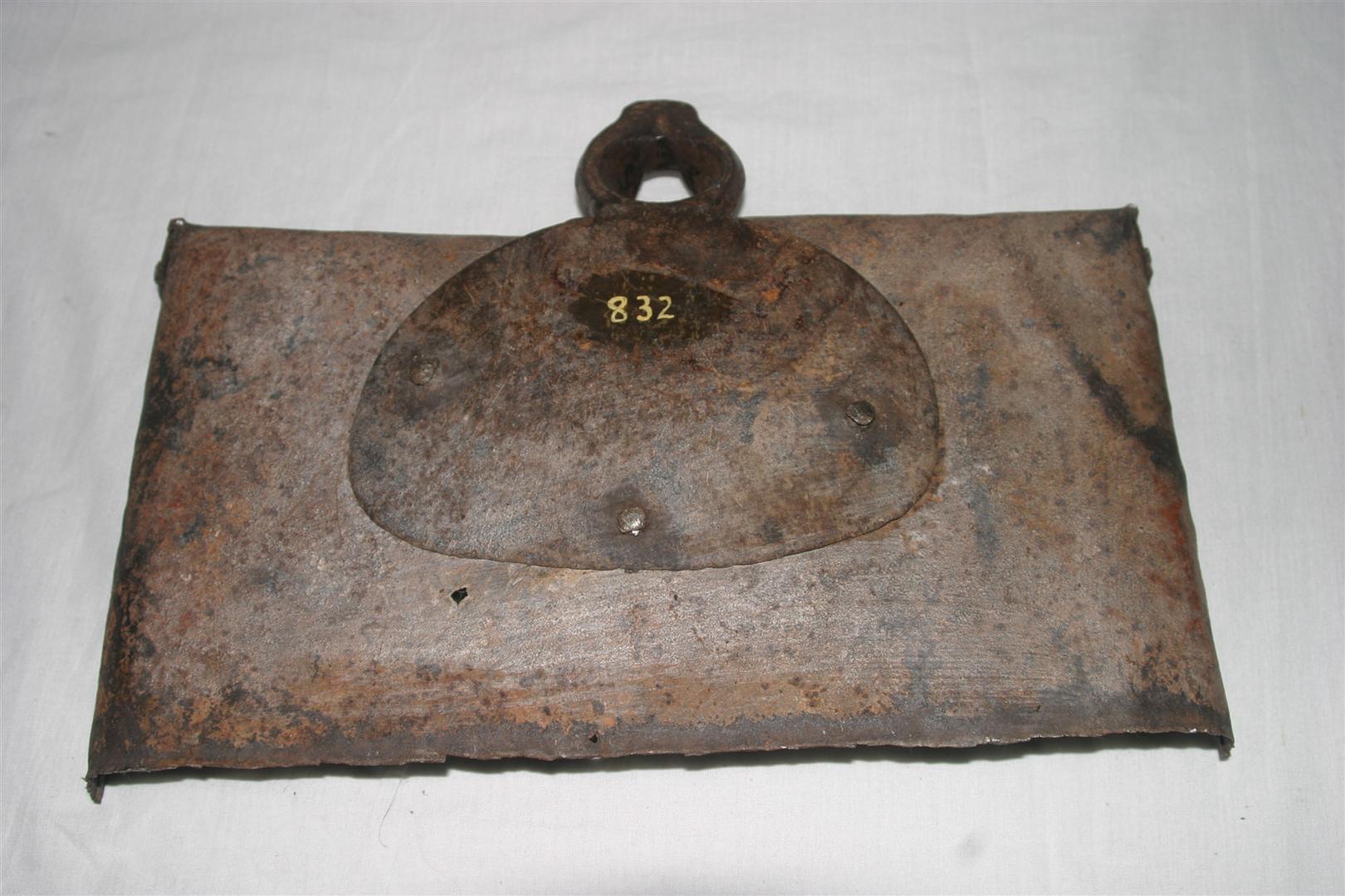 Pá de goiva, de formato retangular, confeccionada em metal (ferro), composta por abas recortadas e unidas nas laterais por pregos no mesmo metal. No verso do objeto, apresenta estrutura ovalada e chapada fixada por três parafusos e arrematada na parte superior por aro de metal, para encaixe de cabo (este inexistente).
