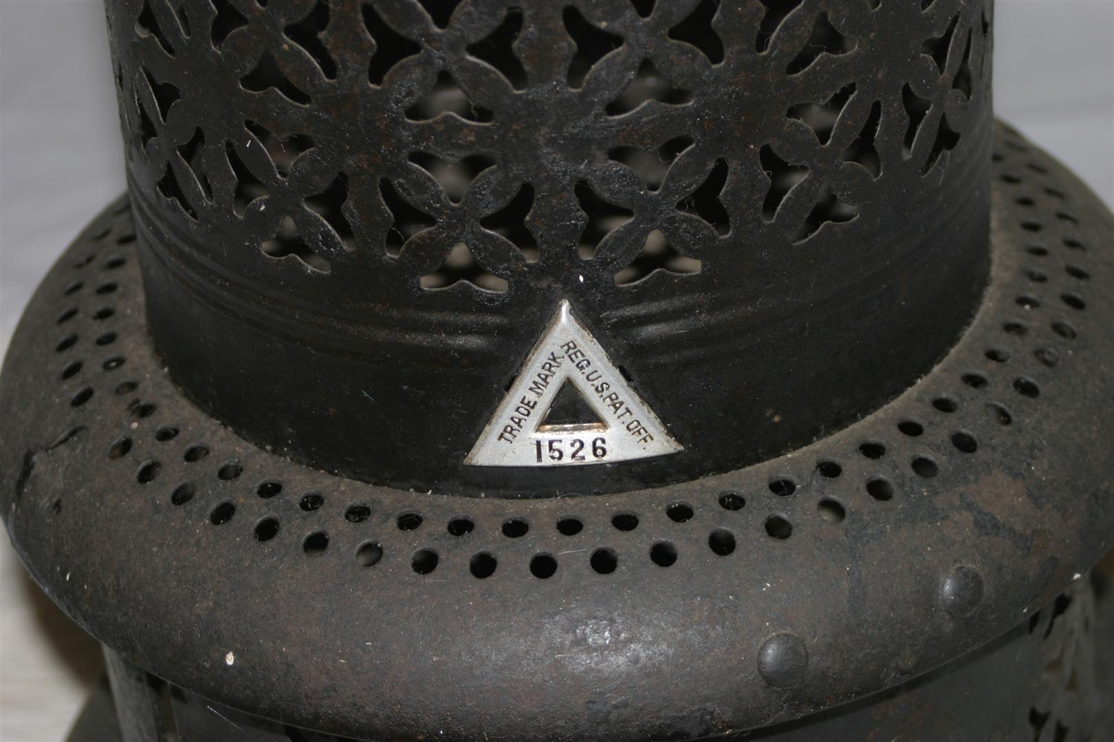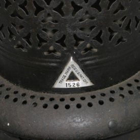 Lampião de grande porte confeccionado em metal (ferro) pintado de preto e esmaltado de branco. Na parte superior, gancho em “S” ligado ao corpo do objeto por aros, para fixação no teto. Parte central em tubo cilíndrico encimado por duas bolachas, a superior de dimensão menor e a inferior em formato de “bóia”. No tubo cilíndrico, recorte retangular com mecanismo de funcionamento do lampião parcialmente aparente, composto por tubo delgado com arruelas facetadas e fio de metal ligado à “bóia” maior com regulagem de passagem do gás, em pino “T”. Parte inferior do objeto em disco com a parte interna esmaltada de branco contendo as seguintes inscrições duplicadas: “ALADDIN”. Ao centro do disco, estrutura ligeiramente côncava em ferro e estrutura cilíndrica contendo a parte central em malha de metal quadriculada. No disco, dois pinos que se assemelham a uma das partes de uma dobradiça, além de estrutura em metal para encaixe de parte inexistente.