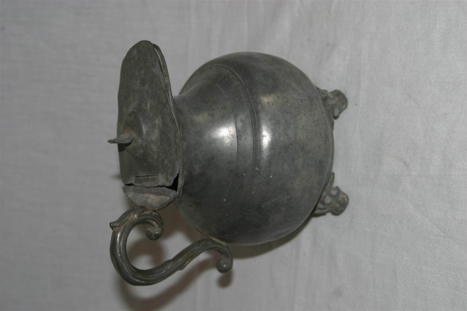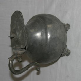 Leiteira, de dimensões médias, confeccionada em metal (estanho) com alça em curva e tampa, apoiada sobre quatro pés estilizados. Apresenta corpo bojudo, ornado por quatro frisos simples, alça em formato de voluta e tampa abaulada, esta fixada à estrutura por dobradiça e arrematada por concha. Fundo liso.