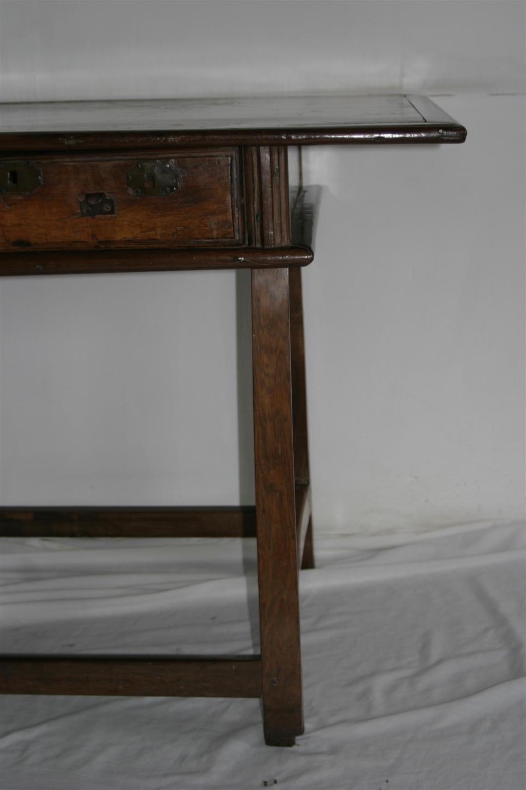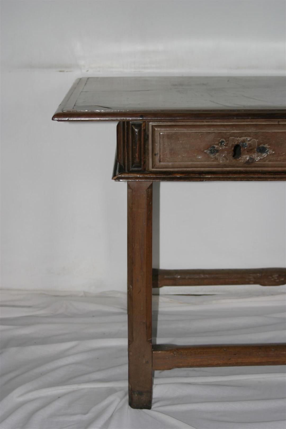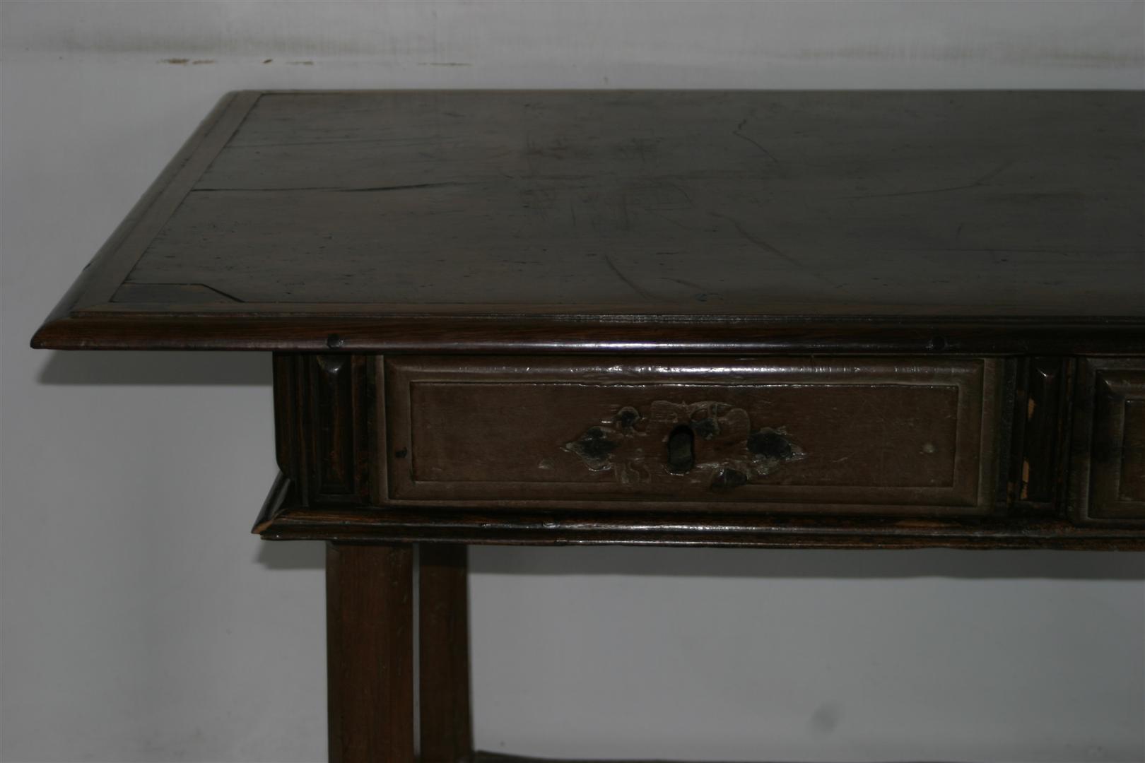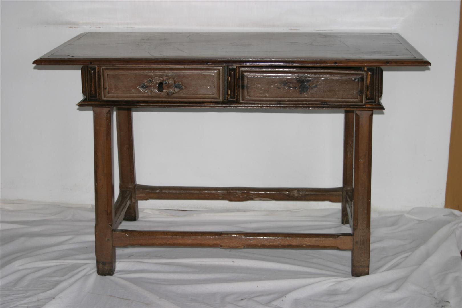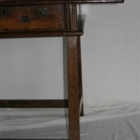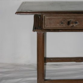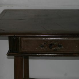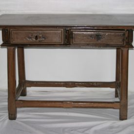 Mesa de encostar, identificada como “mesa holandesa”, de manufatura rústica e típica da região de Minas Gerais, confeccionada em madeira (jacarandá mineiro). Apresenta tampo liso e saliente, de formato retangular, emoldurado por friso delgado, e com extremidades em ângulo reto. Caixa retangular apoiada sobre fundo composto por duas tábuas de madeira, tendo as laterais lisas e ladeadas por estruturas em friso verticalizado. Na parte frontal, duas gavetas entremeadas por três frisos verticais, sem espelho de fechadura, emolduradas por frisos. Peça sustentada por quatro pernas retilíneas, de secção octogonal, tendo corte quadrangular mais espesso na parte superior de cada perna. Apresenta travejamento interligando as quatro pernas e pés de cavalete.