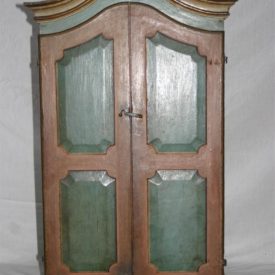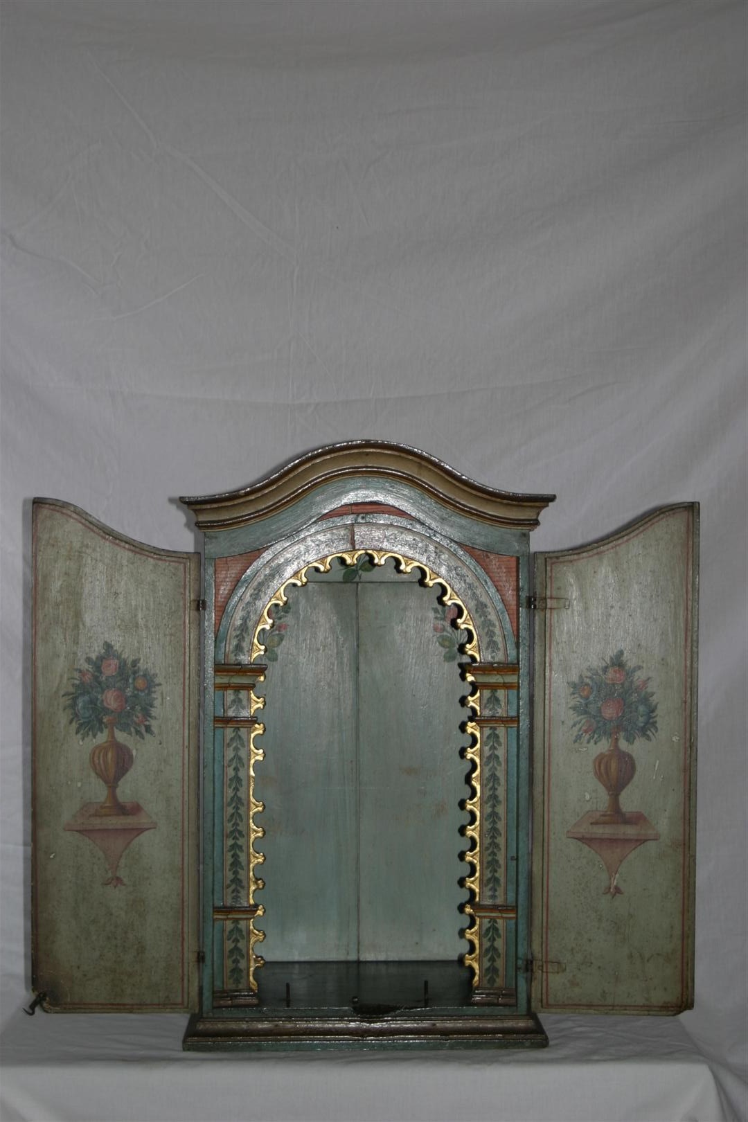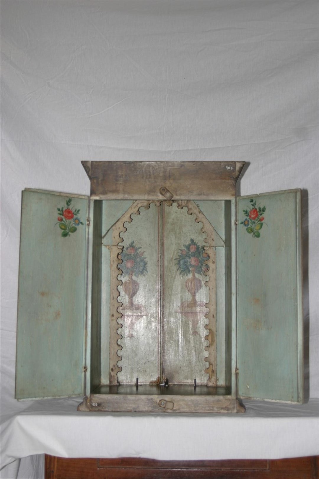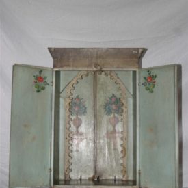 Sobre Arte Sacra: “Era a religião o principal fator comum na sociedade colonial brasileira setecentista. A religião católica, com a variedade do seu culto, estava presente no dia-a-dia, quer nos jejuns e abstinências, quer através de ofícios divinos, confissões e comunhões, quer com procissões e festas religiosas./ A devoção religiosa no antigo Arraial do Tijuco foi descrita pelo viajante George Gardner (1942, p.384) da seguinte maneira: “A cidade conta três ou quatro belas igrejas; uma delas, chamada N.S. do Rosário, que pertence aos negros da costa da África, e tem sobre um elevado altar a imagem da Virgem preta. Como morávamos perto desta igreja, assisti muitas noites às celebrações de uma de suas festas a que se achavam presentes, além dos pretos que habitualmente freqüentavam a igreja, muitos dos mais respeitáveis representantes do sexo masculino e feminino da cidade./ Tudo se fazia com perfeita propriedade e certa noite ouvi excelente sermão pregado por um dos sacerdotes locais”./ Minas Gerais, província do ouro e do diamante, centro de riqueza do Brasil colônia por quase um século, teve condições excepcionais de possuir uma imaginária rica. Na significativa produção mineira, se destacam as pequena imagens domésticas adequadas aos oratórios, que, desde o fim do século XVIII, adornavam as casas de família. Estes oratórios, geralmente de pequeno porte, surgiram em face da fé religiosa e do aumento da população com a febre da mineração. Dentre esta produção podemos destacar os conhecidos oratórios D. João V. Com talha rococó e pintura interna, estes oratórios envidraçados são povoados com pequenas imagens de pedra, freqüentemente brancas, com pintura em algumas partes e pouca decoração em ouro, existindo em vários tipos, com tamanhos diversos ou apenas a caixa com o presépio. Foram largamente produzidos do fim do século XVIII até a primeira metade do século XIX, encontrando-se inúmeros exemplares em outros estados do país.” – Peça fotografada para o referido catáologo.” (1)