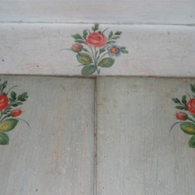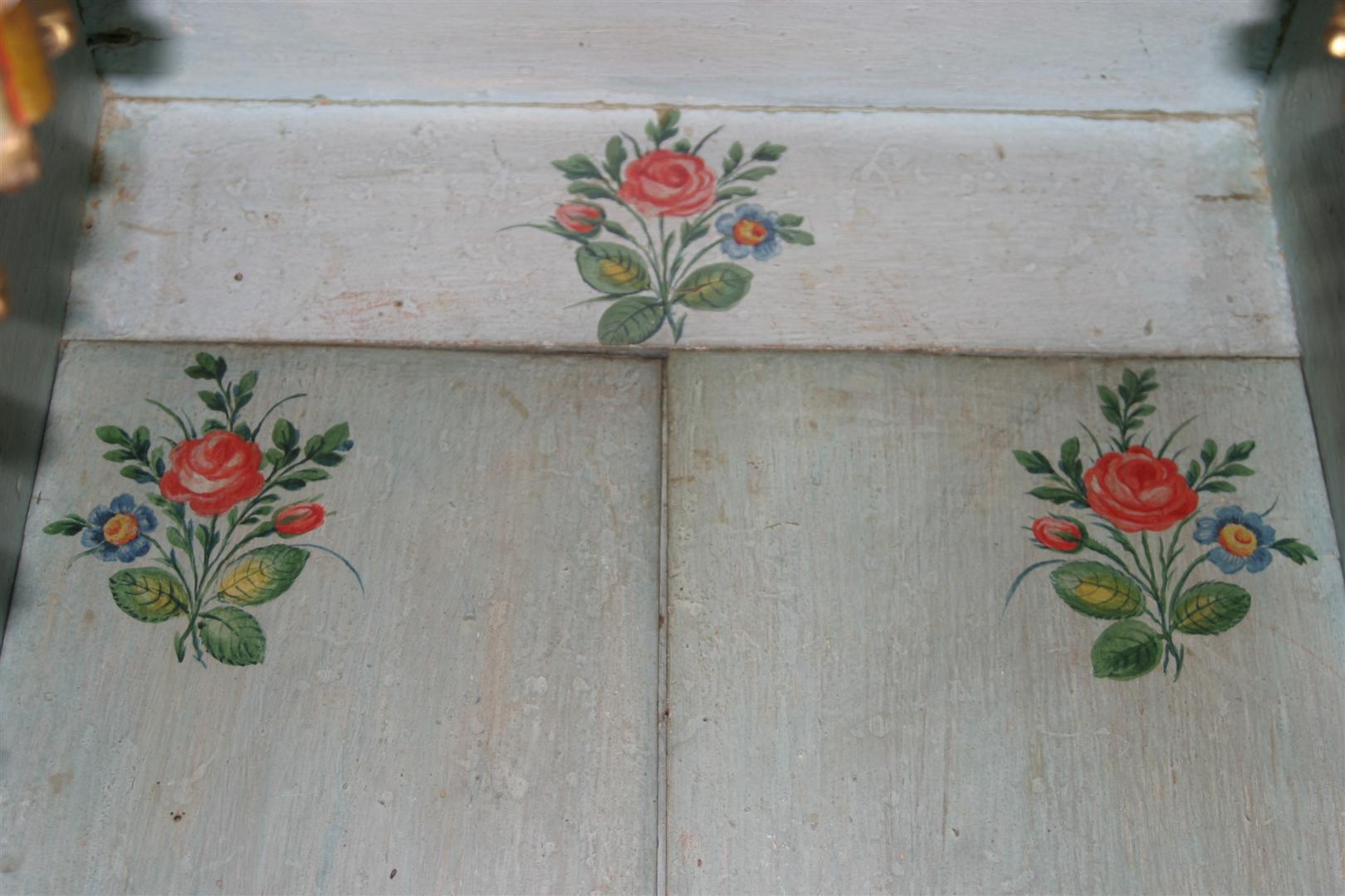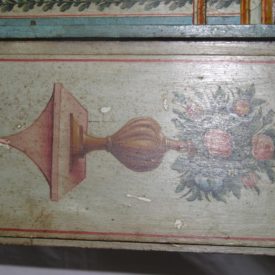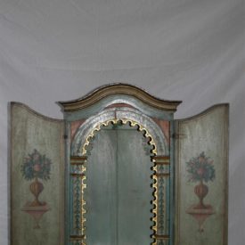 Oratório de pousar, de médio porte, confeccionado em madeira (jacarandá mineiro) entalhada, policromada e dourada. Objeto com estrutura em caixa retangular, contendo molduras retangulares pintadas nas laterais em marmorizado no tom castanho, sobre fundo azul, cercadas por friso preto. Apresenta cimalha em curva nos tons bege, amarelo e azul. Peça com dupla abertura (frente e verso do objeto) feita cada uma por duas folhas de porta. Parte frontal das folhas dianteiras almofadadas pintadas em tom azul sobre fundo amarronzado. Cada folha encontra-se fixada por duas dobradiças em metal, tendo sistema de trava externo e interno em sistema de gancho de ferro. Parte interna de cada folha de porta dianteira em tom azul, cercada por friso vermelho, contendo peanha em tom vermelho claro, encimada por vaso em tom amarelo ornado por gomos, contendo buquê de flores nos tons vermelho, azul e amarelo, além de ramagens em tom verde escuro. (Cont. em OBSERVAÇÕES) Perfil de camarim composto por duas colunas arrematadas por arco pleno, ornadas por ramagens em série, no tom verde escuro, tendo laço vermelho na parte superior central do arco, além de tracejado em linhas vermelhas horizontais. Na parte interna do perfil de camarim, ornamentação em dourado composta por volutas seriadas. Parte interna do móvel com laterais e fundo ornados por rosinhas-de-malabar nos tons vermelho e azul com ramagens verdes (três rosas ao fundo e duas em cada lateral). Teto e piso da parte interna sem ornamentação. Abertura posterior do objeto em duas folhas de porta com sistema de tranca feito por tramelas de madeira. Peça apoiada sobre base escalonada em tom amarelo e azul. Documentação encontrada no dossiê: 1) Ficha cadastral do Ministério da Educação e Cultura, datilografada e assinada pelo informante e pelo dirigente do órgão, Antonio Eugenio Nascimento e João Brandão Costa (respectivamente), datada de 06/12/1970. 2) Ficha datilografada do MEC/IPHAN, referente ao inventário de 1981, sem assinatura, com foto preto-e-branca. 3) Ficha amarela de fichário, datilografada, com 2 fotos preto-e-brancas, que cita: “Um oratório de madeira, pintado com portas almofadadas com 73 x 41 proc. Da Igreja de S. Francisco”. 4) Ficha de Catalogação de Acervo Museológico, registrada por Tânia Bravo Leite (1989) e revisada pela museóloga do Museu da Inconfidência, Celina Santos Barboza, em 1989 (ficha datilografada). 5) Ficha de Acervo Museológico GMCH/MG, em formato de fichário, assinada por Tânia Bravo Leite e por Celina Santos Barboza (1989/1991), com foto preto-e-branca. 6) 01 foto preto-e-branca. 7) Ficha do IPHAN/ 13ª Coordenação Regional, assinada por Ronney Leite Brito, referente à Análise do Estado de Conservação do Acervo/ Museus Vinculados 13ª CR, datada de 19/12/1995.
