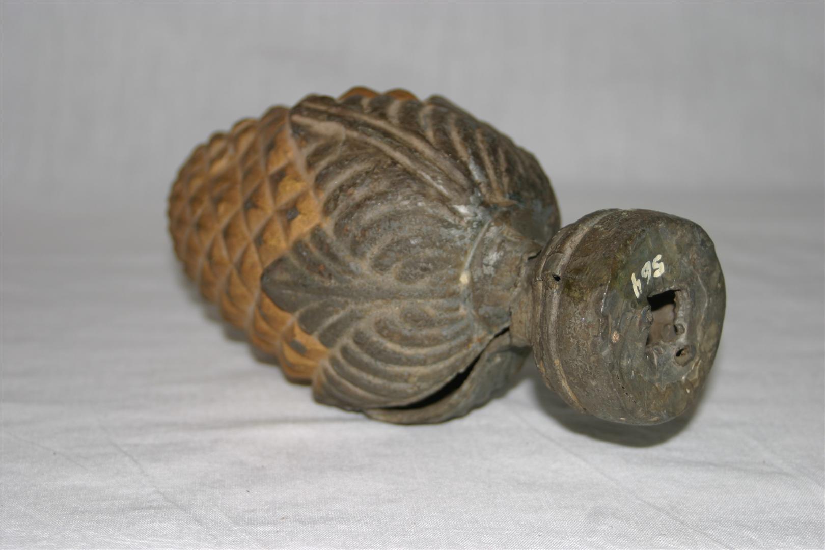 Sobre Pinha: “Peça ornamental de cerâmica, vidro, metal, etc., de forma aproximadamente cônica ou ovóide e que imita o fruto do pinheiro; é decorado com escamas ou saliências. Serve de remate com cornijas, frisos, pilares de portões, extremidades de balaustradas, etc (...) Pinhas e bolas de sacada. Ornatos de cerca de 0,20 m de altura feitos de cristal, vidro, de bronze, de ferro para guarnecer as sacadas ou a coluna da base das escadas.” (1)