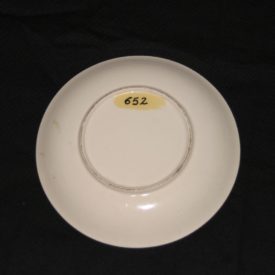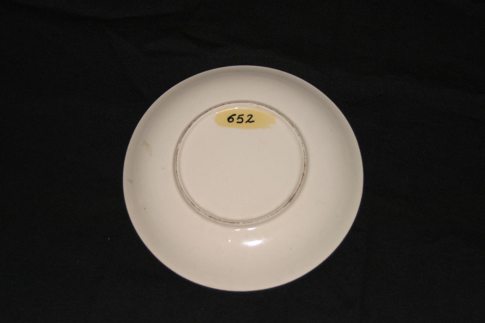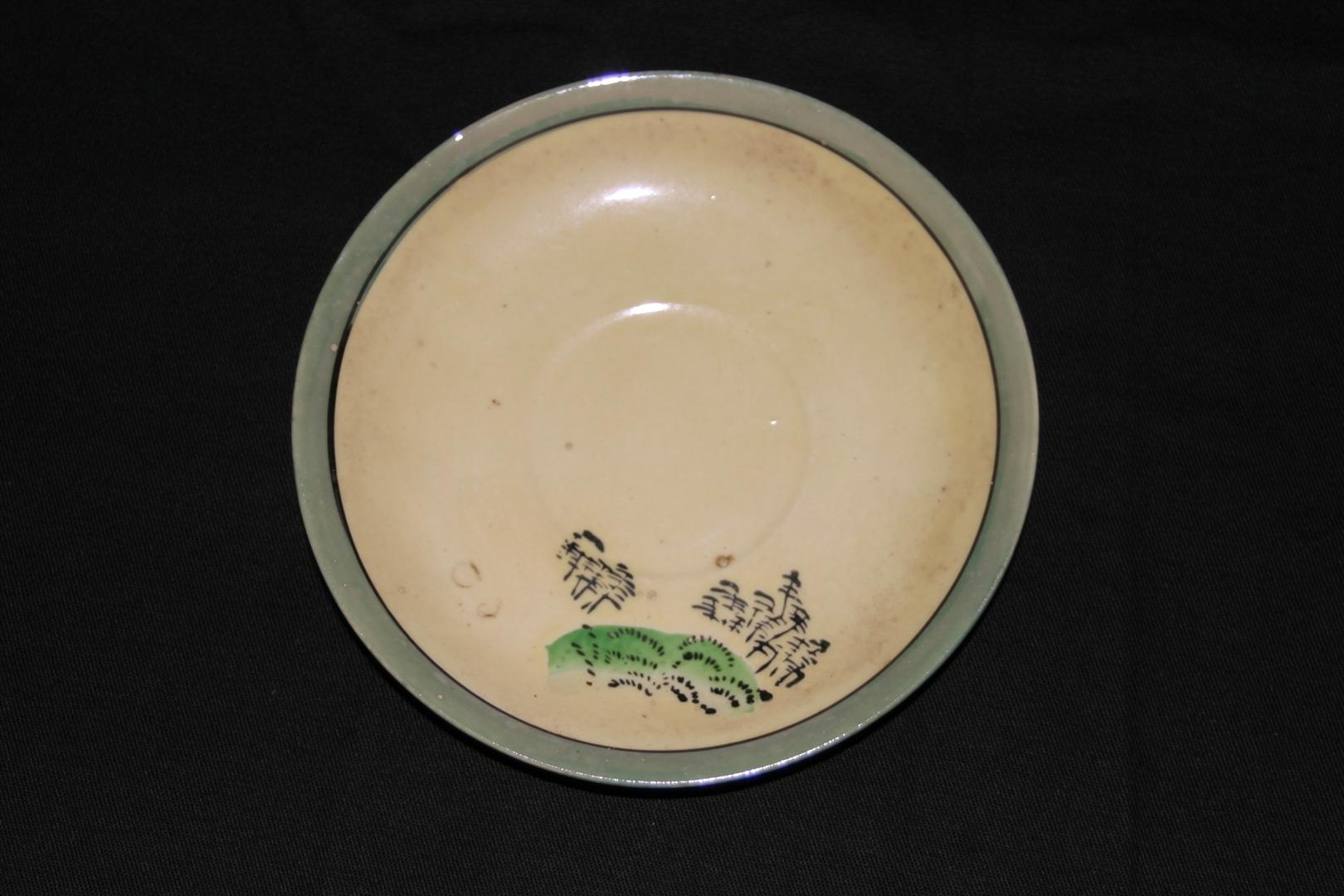Pires confeccionado em porcelana branca, de estrutura rasa. Apresenta cena orientalizada à direita da superfície, sob fundo em tom amarelo claro, tendo representação de vegetação em tom verde e arvoredos em tom preto. Borda em tom azul acinzentado, ornada por friso simples em tom preto. Parte posterior do objeto em porcelana branca lisa. Sem marca.