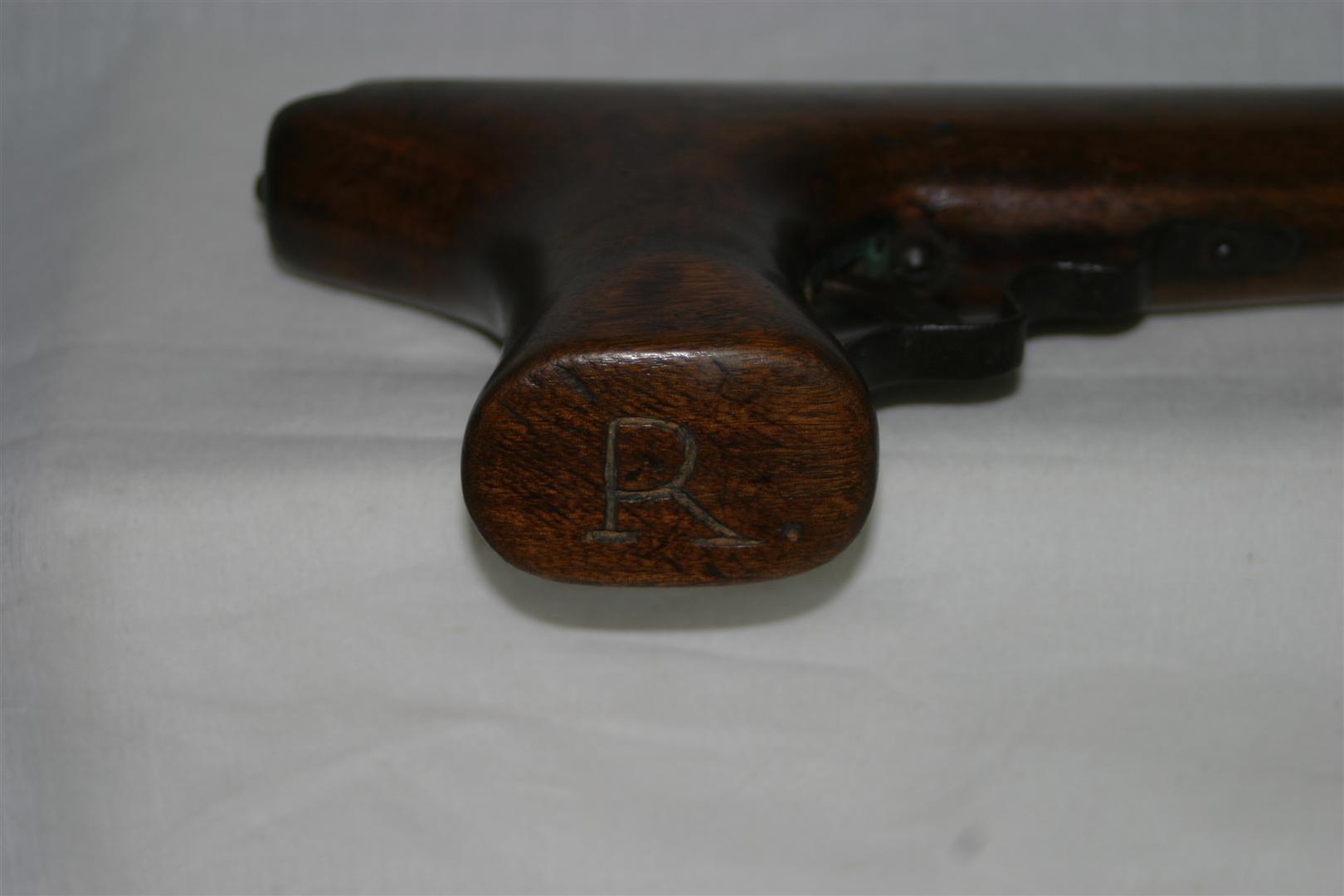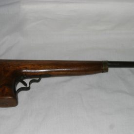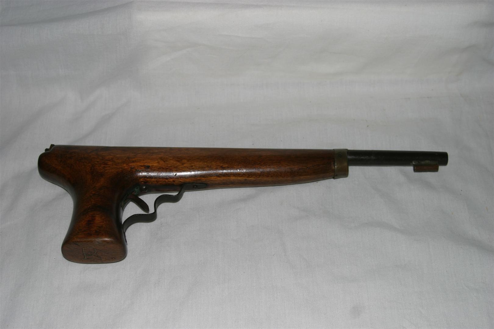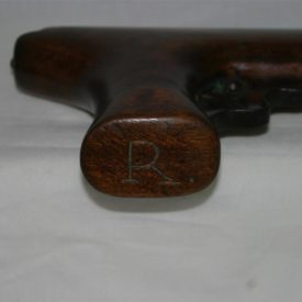 Pistola, de médio porte, confeccionada em metal (ferro e latão) e madeira. Objeto composto por cano cilíndrico e delgado, com pequena estrutura cilíndrica disposta na parte inferior. Parte central do objeto em madeira arrematada na extremidade por anel de latão, tendo, na parte inferior, haste sinuosa fixada por dois pregos que recobre o gatilho. Coronha madeira, com a seguinte inscrição incava na extremidade: “R.”
