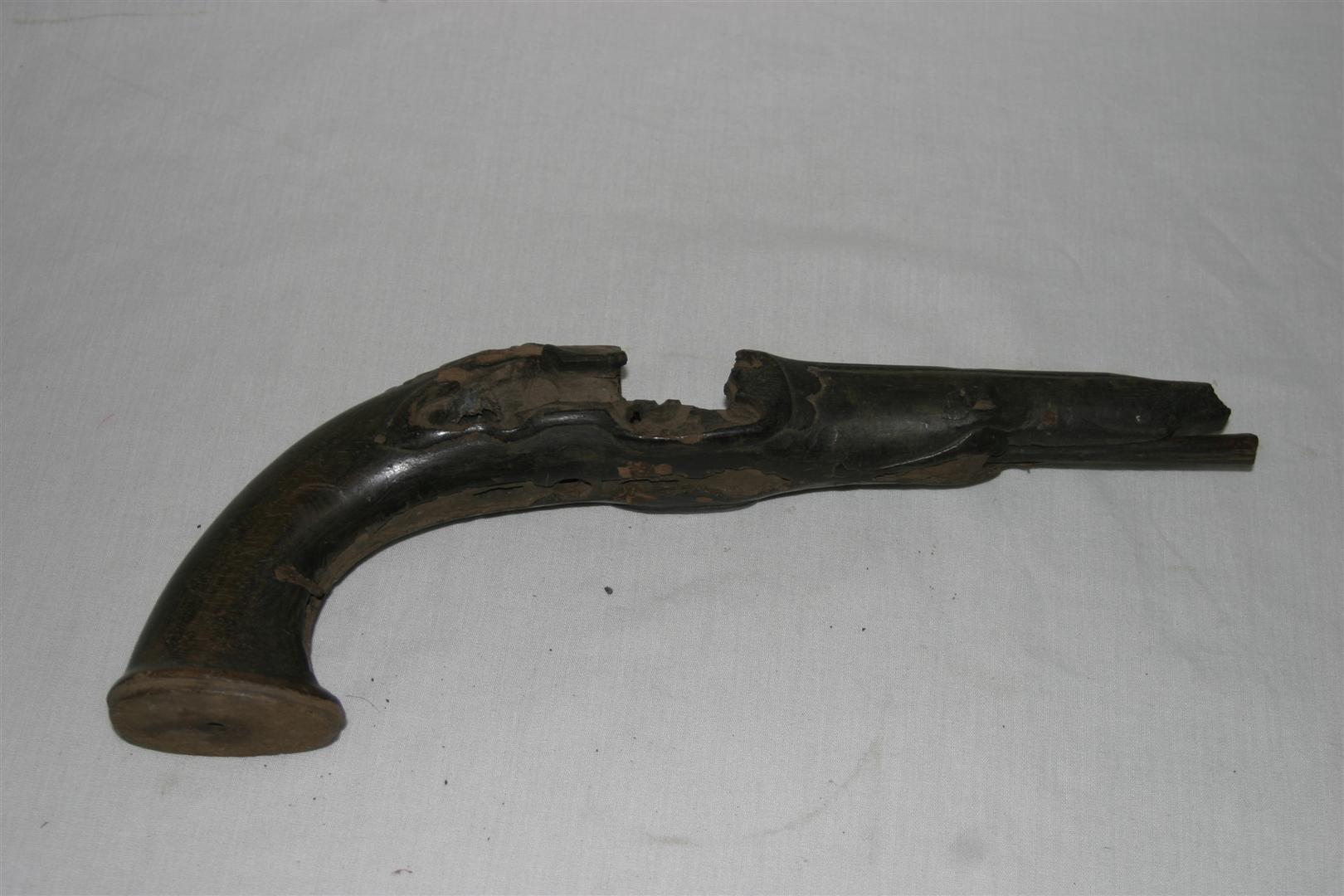 Pistola de médio porte confeccionada em madeira torneada, com ornatos entalhados na parte superior. Apresenta coronha em madeira torneada e em curva, com base ovalada. Na parte superior, ornatos em motivos fitomorfos, e, nas laterais, emolduramento com friso. Peça de cano longo com ornatos e vareta, esta acoplada paralelamente na parte inferior.