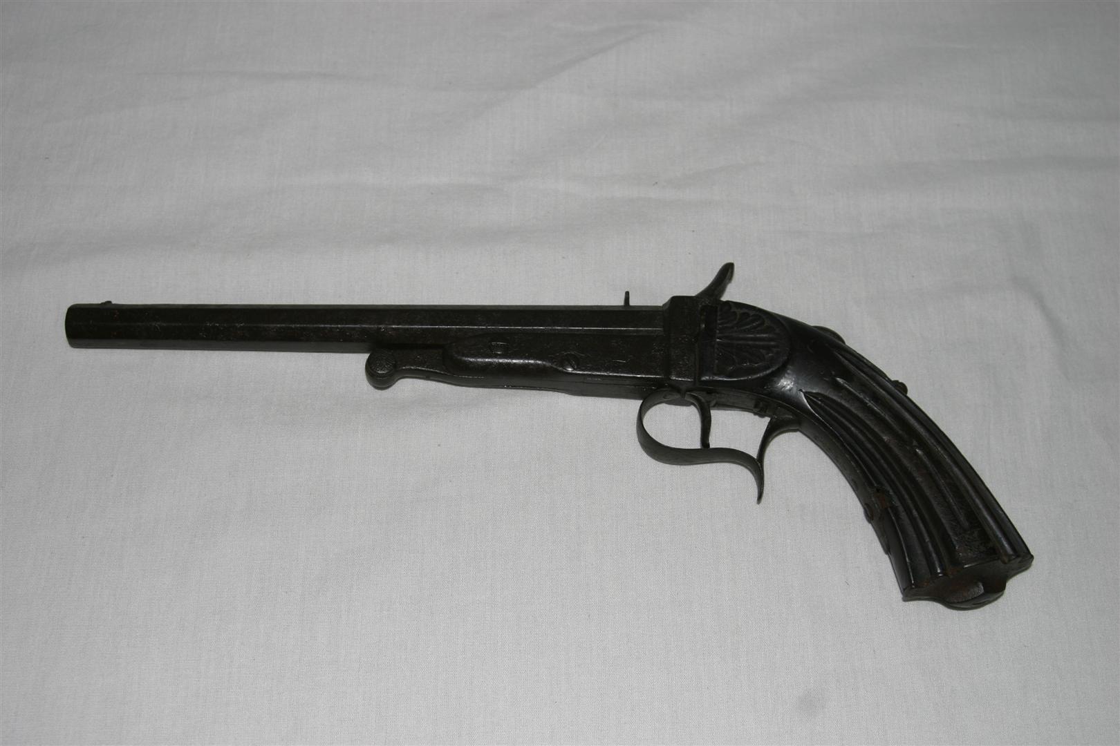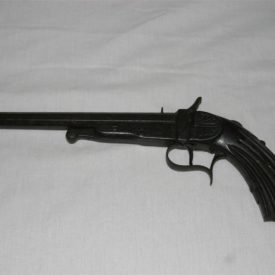 Pistola, de grande porte, confeccionada em metal (ferro) e madeira. Objeto de estrutura longilínea, composto por cano octogonal, facetado e delgado, com pequeno pino na extremidade para mira do alvo, tendo, na parte inferior, estrutura em ferro com haste central arrematada por círculo. Na parte central, a seguinte inscrição gravada nas duas laterais: “RIO JANEIRO”. Na parte superior do objeto, cão em haste de ferro levemente abaulada para engate do sistema de disparo. Na parte inferior, pequena haste em curva correspondente ao gatilho, cercada por chapa sinuosa. Apresenta coronha em curva, com corpo ornado por estrias e arrematado (na parte próxima ao gatilho) por folha de acanto em relevo, e, na parte inferior, por medalhão recortado em ferro, com a parte central proeminente e em formato de losango.