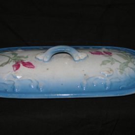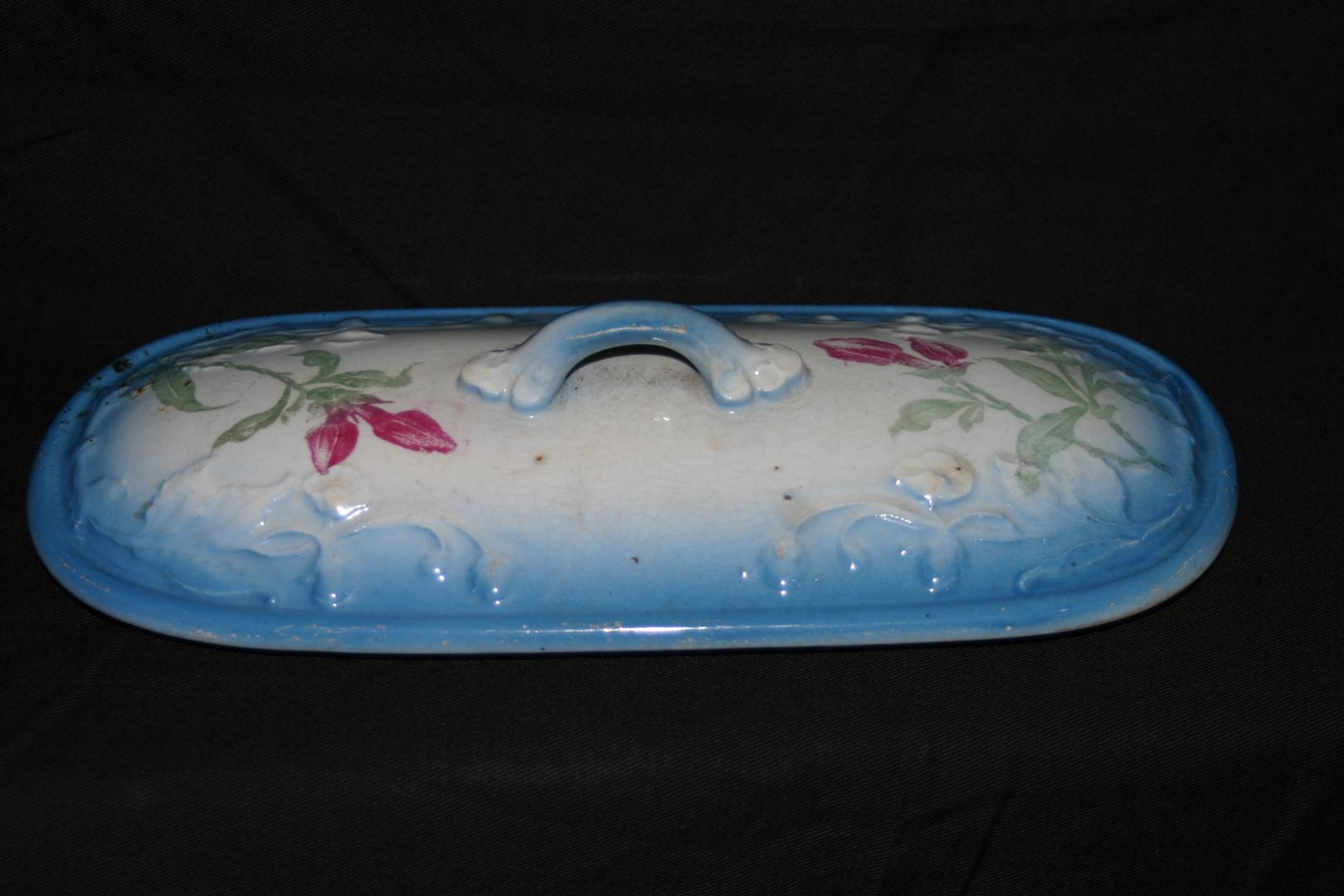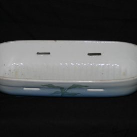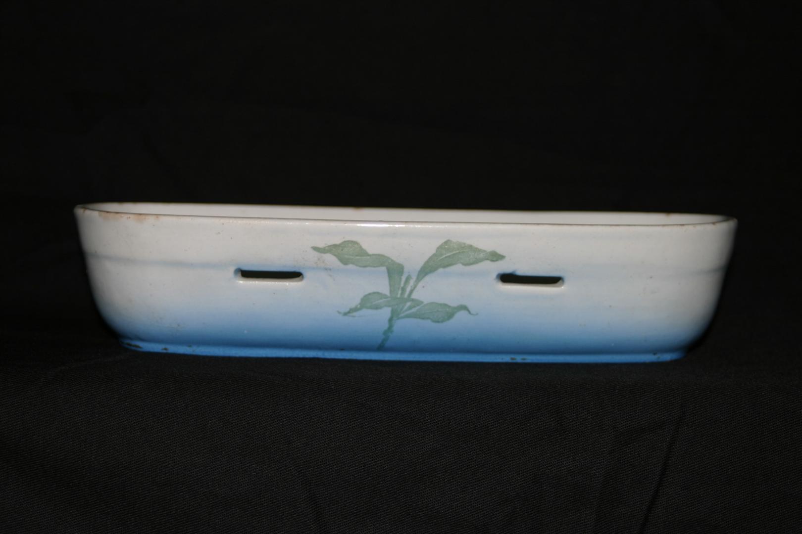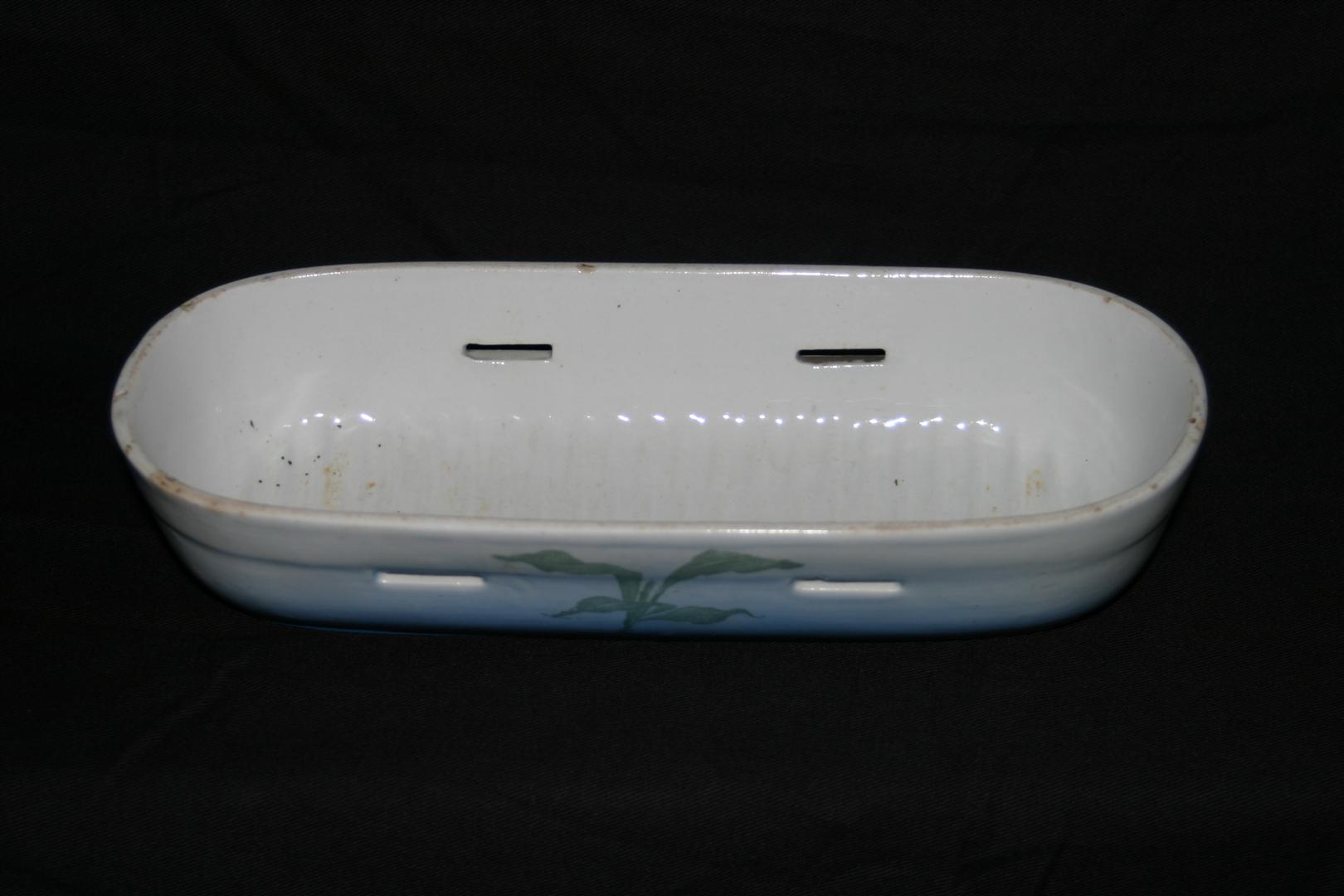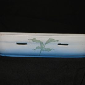 Porta-escova, de formato longilíneo, em caixa ovalada, confeccionada em porcelana branca com friso azul e ornamentação floral. Objeto com tampa ovalada arrematada por alça em meio-arco, no tom azul com extremidades brancas terminadas em motivos fitomorfos. Superfície da tampa branca ornada por dois ramos de flores com botões vermelhos e ramagens verdes, dispostos um de cada lado. Apresenta friso em meia-cana com ornamentação em motivos florais (em relevo) na borda da tampa. Parte inferior interna do objeto branca, tendo quatro riscos retangulares vazados, dispostos dois de cada lado, com fundo estriado em relevo. Parte externa branca, tendo a parte inferior em tom azul, destacando-se ornamentação com ramagem verde de cada lado. Fundo branco estriado. Sem marca.
