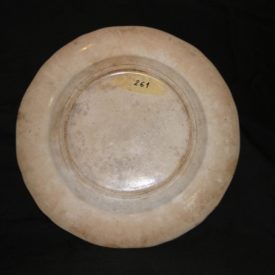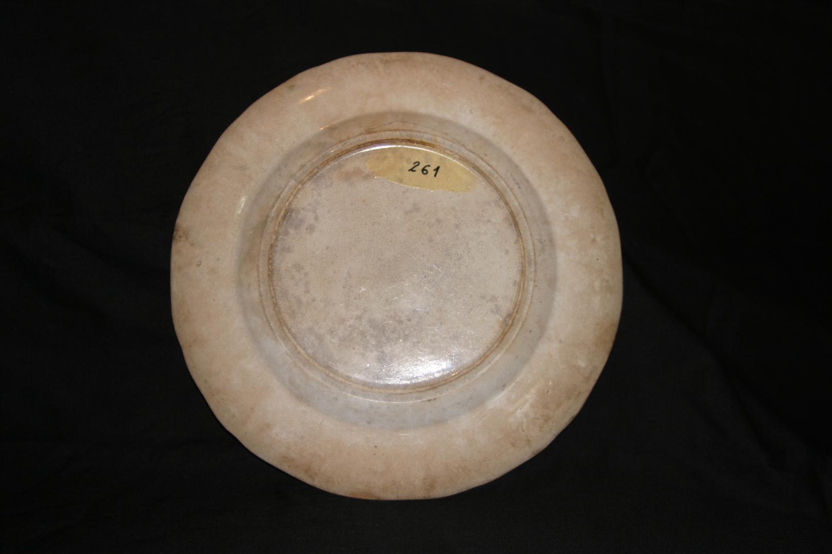Prato raso confeccionado em porcelana branca com ornamentação em tom azul. Peça de formato circular, com borda em ondulados. Na parte central do campo, cena campestre tendo, em primeiro plano, à direita, árvores altas e escadaria, além de grande ânfora apoiada sobre pedestal e vegetação rasteira. À esquerda, lago com barco e duas figuras humanas em seu interior. Em segundo plano, à esquerda, palácio com torres e, à direita, outra construção. Ao fundo, paisagem montanhosa sob fundo branco. Na borda do objeto, ornamentação composta por série de motivos fitomorfos (dispostos em círculo), encimada por cinco conjuntos de flores, e tendo extremidade com decoração em linhas cruzadas e pequeno riscos. No verso do objeto, a inscrição “C”.