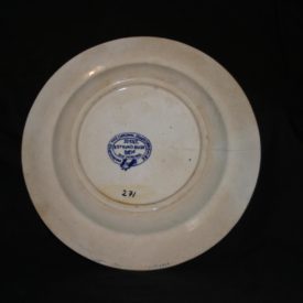 Prato, de formato circular, confeccionado em porcelana branca e em azul cobalto, do serviço conhecido como “azul pombinho”. No campo, cena orientalizada onde aparece, à direita, palácio e pagodes cercados por vegetação típica da região, destacando-se, na parte superior, uma macieira com trinta e duas maçãs. Na parte frontal, cerca e gramado, onde se vê salgueiro estilizado encimado por casal de pombinhos. À esquerda da cena, três figuras humanas, com instrumentos nas mãos, atravessam a ponte em direção a uma ilha. Na parte superior, representação do mar com embarcação sendo conduzida por figura masculina. Logo acima, outra ilha com pagode e vegetação. Borda com ornamentação geométrica em losangos, quadrados, motivos fitomorfos, círculos, pontilhados e emolduramentos em volutas. Fundo branco com a seguinte legenda em azul cobalto: “WARRANTED THE ORIGINAL STAFFORDSHIRE”, e na parte central, os nomes do fabricante e do distribuidor: “JM&S./ ESTEVÃO BUSK/ & Ciª/ RIO DE JANEIRO”.