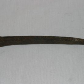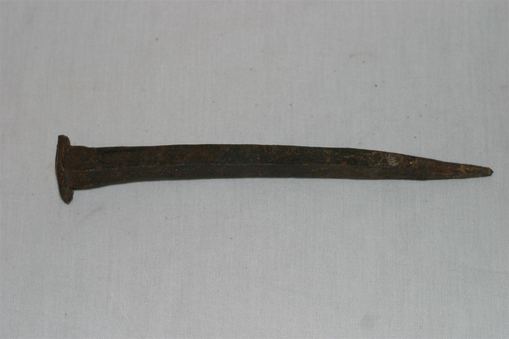 Prego, de grandes dimensões, confeccionado em metal (ferro), de haste longilínea e secção quadrangular, terminado em ponta. Extremidade superior de formato trapezoidal, com lados ligeiramente abaulados.