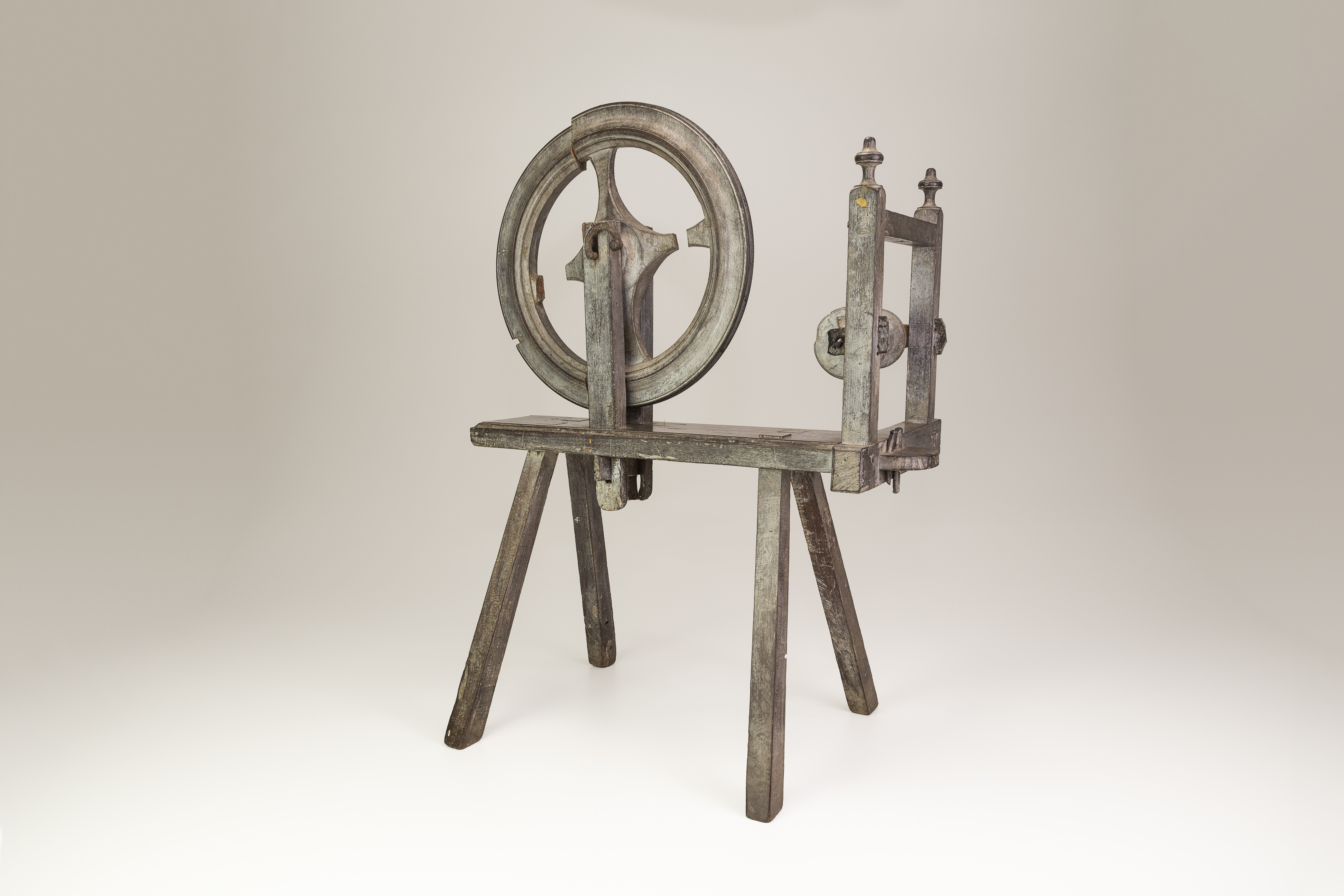 Roca de fiar confeccionada em madeira (jacarandá), sustentada por quatro pés retos, posicionados em diagonal, tendo a parte central em tábua delgada, de formato retangular, arrematada por estrutura quadrangular composta por quatro hastes encaixadas (duas delas com pinos na parte superior), com prolongamento para encaixe de roldanas (3 exemplares). Na outra extremidade, estrutura circular correspondente à roda, ornada por frisos e presa à tábua através de duas hastes verticais com eixo em ferro, que permite o funcionamento do sistema giratório para enrolar a lã. Parte central da roda com decoração recortada em curva, contendo quatro extremidades.