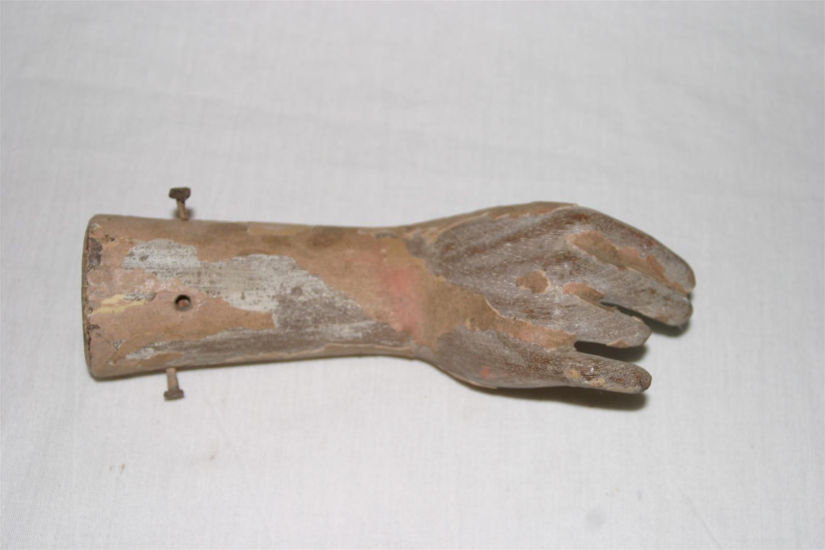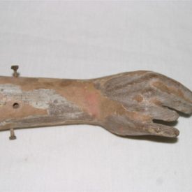 Antebraço e mão de santa de roca, correspondente ao lado direito, de pequenas dimensões, confeccionado em madeira (jacarandá mineiro) entalhada e pintada. Peça de linhas delicadas e carnação em tom róseo, tendo, na extremidade inferior, orifício para encaixe na estrutura do braço (este inexistente). Objeto em posição reta, com mão elevada e dedos voltados para dentro, tendo o dedo mínimo mais elevado que os demais (possivelmente para segurar atributo). Dedos indicador e médio unidos lateralmente. Apresenta dedos delgados, com separação, e unha do dedo polegar bem delineada (restante dos dedos parcialmente quebrados). Na parte superior da mão, representação dos ossos em relevo e, na palma da mão, um traço bem marcada. Na parte interna do pulso, representação das veias em relevo. Extremidade com dois pregos e orifício.