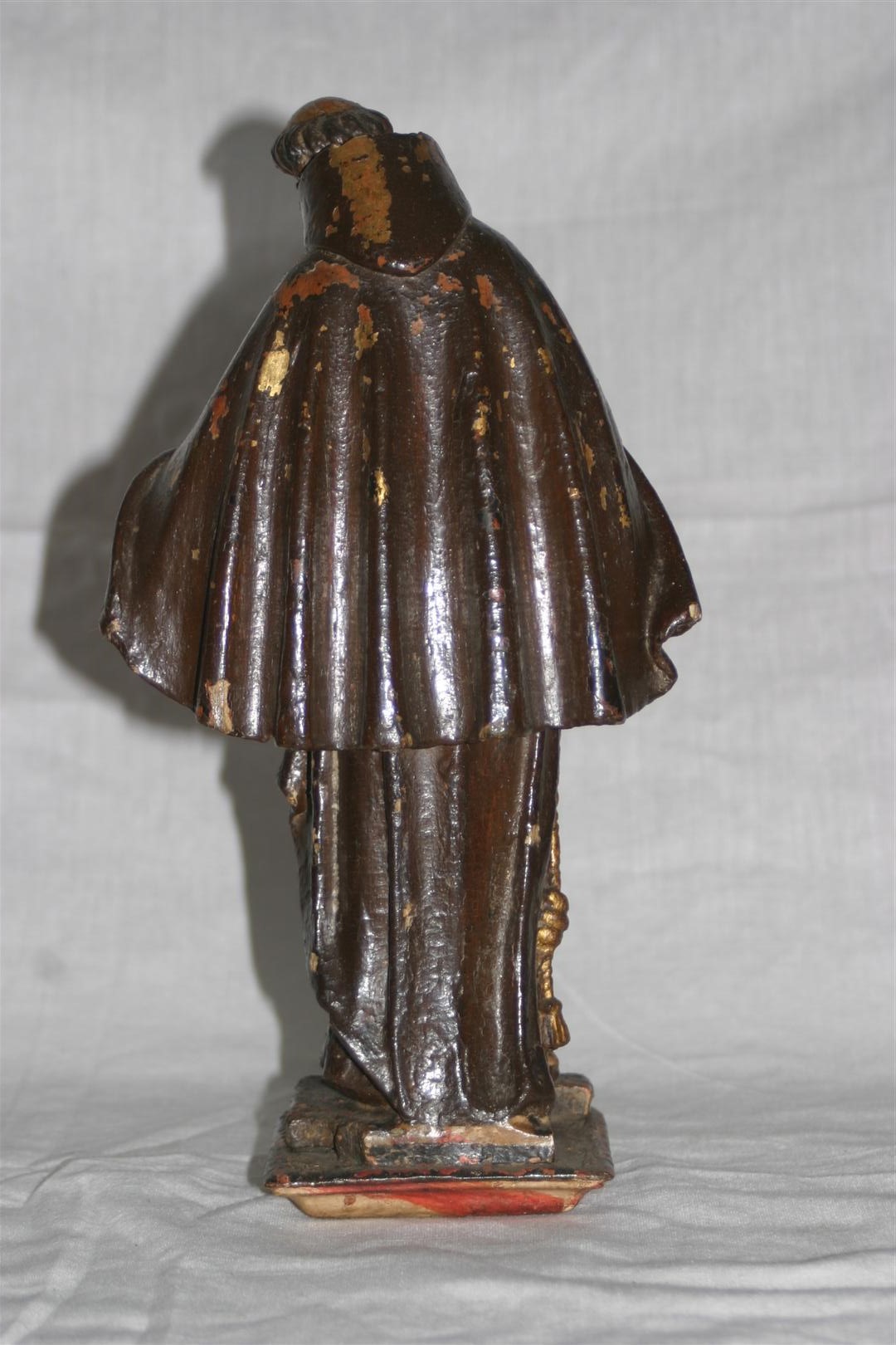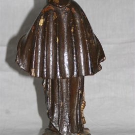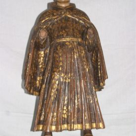 Sobre Santo Antônio de Pádua ou Antônio de Lisboa (1195-1231): “Chamava-se Fernando, nasceu em Lisboa e morreu em Pádua, na Itália. Ingressou na Ordem Franciscanam adotando o nome de Antônio, em homenagem a Santo Antão, e destacou-se como pregador e taumaturgo, ainda em vida./ Sua festa é celebrada a 13 de junho./ Geralmente representado como jovem trajando o hábito franciscano, franzido à cintura por um cordão com três nós. Tem como atributos o crucifixo, um lírio, símbolo da pureza, e o Menino Jesus assentado, ou em pé, sobre um livro, que simboliza uma aparição. Outras representações menos comuns tematizam Santo Antônio dos Pobres ou do Pão, cujos atributos são o Menino Jesus, um alforje ou um avental cheio de pães, que o Santo Antônio oferece aos pobres.” (1) Sobre Arte Sacra: “Era a religião o principal fator comum na sociedade colonial brasileira setecentista. A religião católica, com a variedade do seu culto, estava presente no dia-a-dia, quer nos jejuns e abstinências, quer através de ofícios divinos, confissões e comunhões, quer com procissões e festas religiosas./ A devoção religiosa no antigo Arraial do Tijuco foi descrita pelo viajante George Gardner (1942, p.384) da seguinte maneira: “A cidade conta três ou quatro belas igrejas; uma delas, chamada N.S. do Rosário, que pertence aos negros da costa da África, e tem sobre um elevado altar a imagem da Virgem preta. Como morávamos perto desta igreja, assisti muitas noites às celebrações de uma de suas festas a que se achavam presentes, além dos pretos que habitualmente freqüentavam a igreja, muitos dos mais respeitáveis representantes do sexo masculino e feminino da cidade./ Tudo se fazia com perfeita propriedade e certa noite ouvi excelente sermão pregado por um dos sacerdotes locais”./ Minas Gerais, província do ouro e do diamante, centro de riqueza do Brasil colônia por quase um século, teve condições excepcionais de possuir uma imaginária rica. Na significativa produção mineira, se destacam as pequena imagens domésticas adequadas aos oratórios, que, desde o fim do século XVIII, adornavam as casas de família. Estes oratórios, geralmente de pequeno porte, surgiram em face da fé religiosa e do aumento da população com a febre da mineração. Dentre esta produção podemos destacar os conhecidos oratórios D. João V. Com talha rococó e pintura interna, estes oratórios envidraçados são povoados com pequenas imagens de pedra, freqüentemente brancas, com pintura em algumas partes e pouca decoração em ouro, existindo em vários tipos, com tamanhos diversos ou apenas a caixa com o presépio. Foram largamente produzidos do fim do século XVIII até a primeira metade do século XIX, encontrando-se inúmeros exemplares em outros estados do país.” (2)