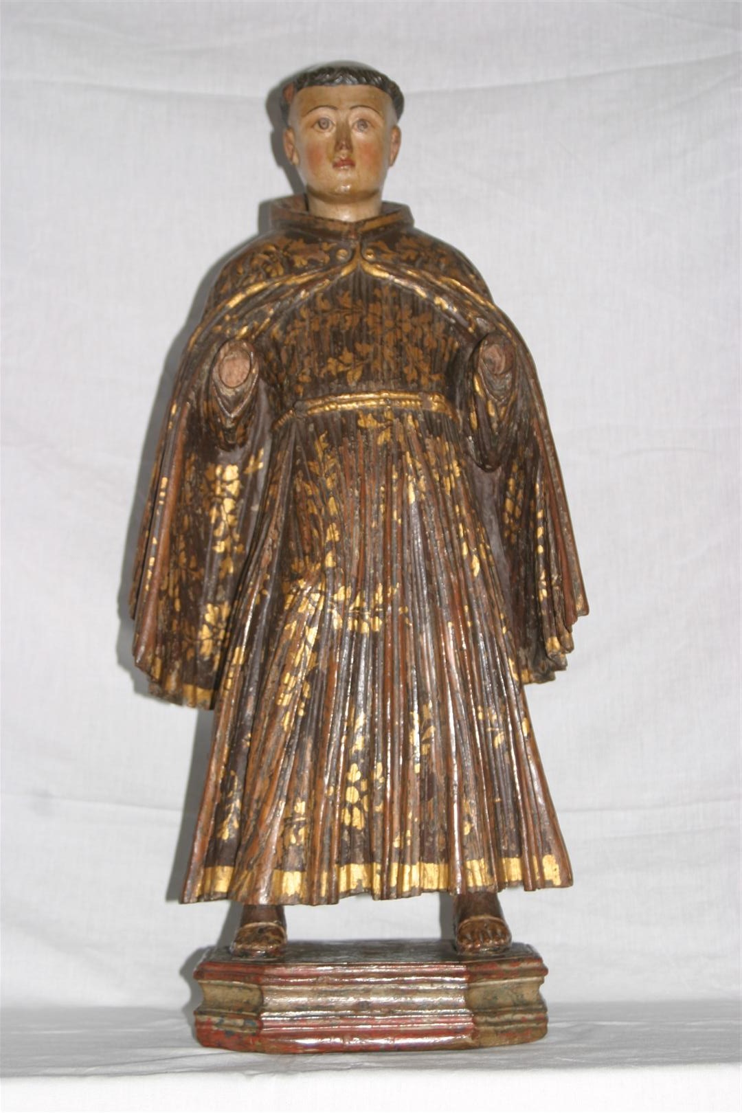 Escultura religiosa, de médio porte, representando Santo Antônio de Pádua, confeccionada em madeira (cedro) entalhada, policromada e dourada. Figura masculina, jovem, de pé, com cabeça inclinada à frente e à direita, com cabelos castanhos escuros em tonsura e orifício na parte superior da cabeça (para encaixe do resplendor – este inexistente). Carnação em tom bege e alaranjado. Apresenta testa curta, rosto oval, orelhas aparentes, sobrancelhas e olhos pintados em tom castanho, nariz aquilino, bochechas rosadas e boca pequena pintada em tom vermelho. Traja hábito da Ordem Franciscana, composto por túnica de mangas compridas, em tom marrom escuro, cintada e com cíngulo dourado com os três nós (simbolizando obediência, castidade e pobreza). Braços flexionados segurando manto, em posição de apoio ao Menino Jesus (este inexistente). Pés aparentes, calçados com sandálias de tiras pretas. Apresenta sua perna direita ligeiramente flexionada, tendo a parte posterior do pé elevada. Panejamento bem marcado, mas com pouca movimentação. Sobre a túnica, manto curto com pregas bem definidas na parte posterior do traje. Indumentária com diversos pontos aparentes de douramento. Peça apoiada sobre base quadrada e escalonada, com a parte inferior em marmorizado nos tons vermelho e bege. No fundo, apresenta orifício. Repintura grosseira em sua mão esquerda.