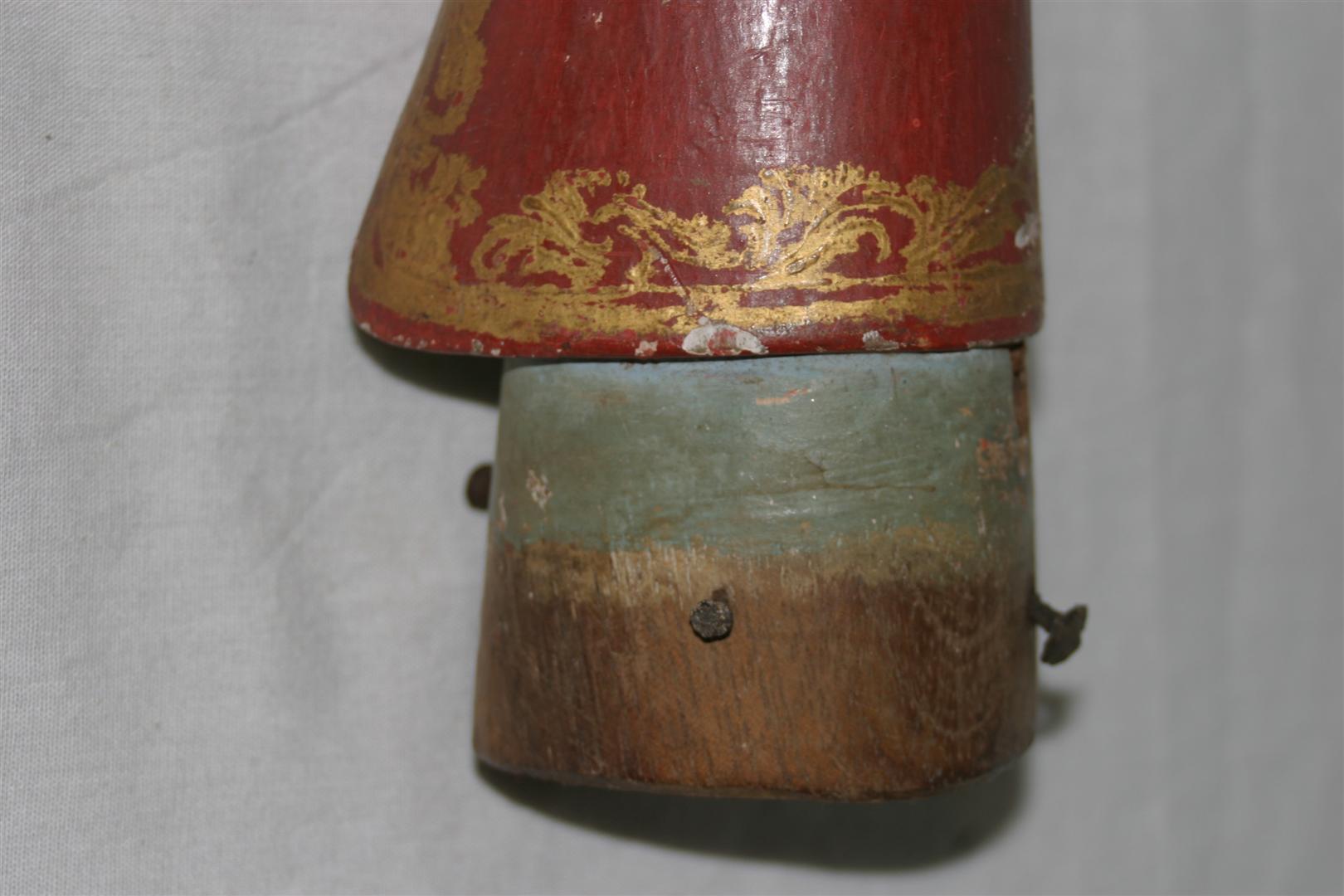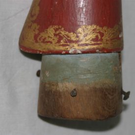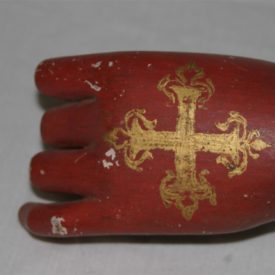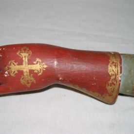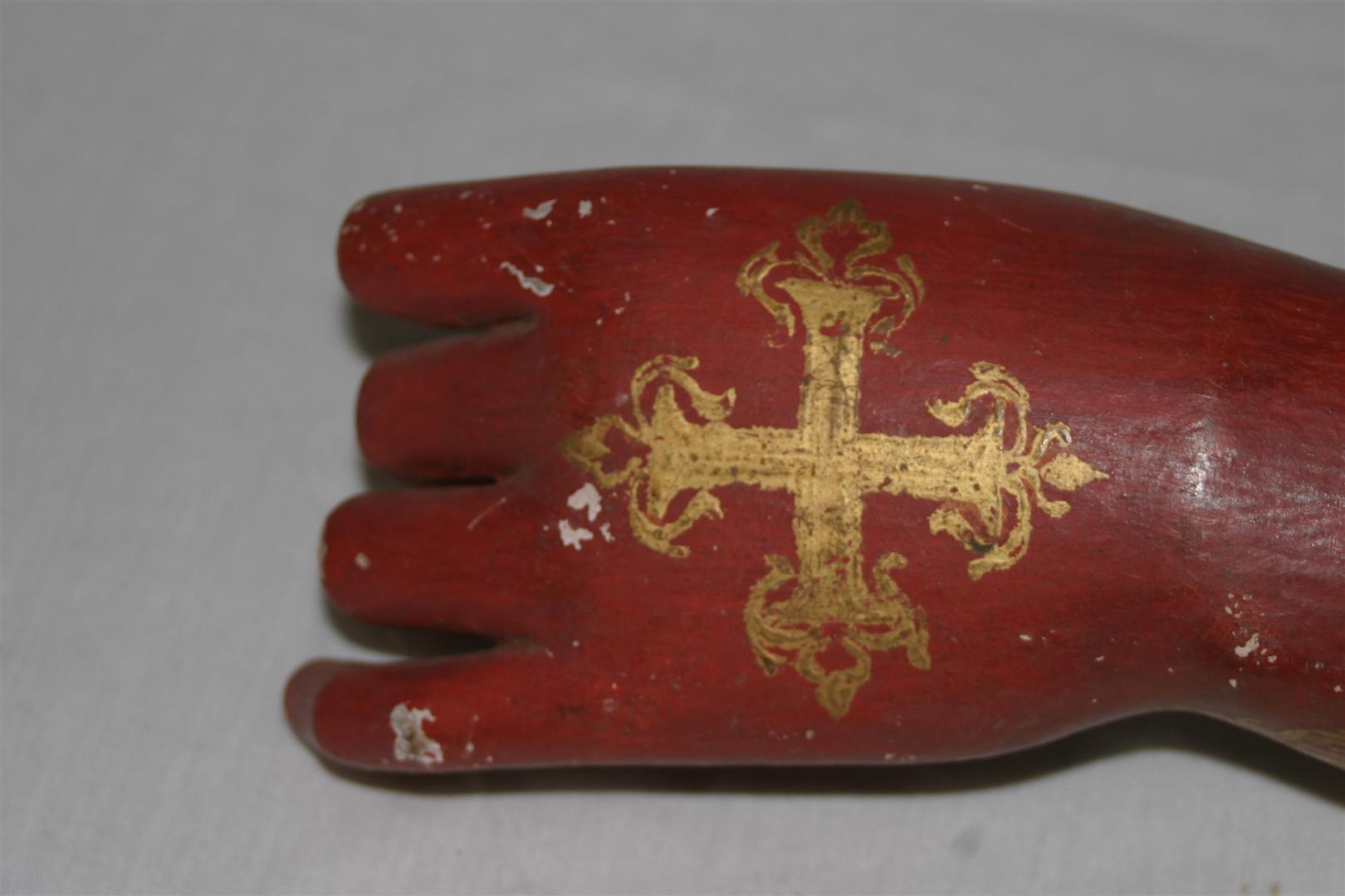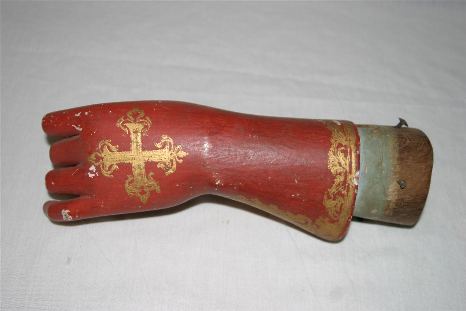 Antebraço e mão de santo de roca, possivelmente de um Santo Papa, correspondente ao lado esquerdo, de tamanho médio, confeccionado em madeira (cedro?) entalhada, pintada e dourada. Peça composta por luva com abertura lateral, em tom vermelho, ornada por barra com motivos fitomorfos em dourado, tendo, na parte superior da mão, cruz florida dourada. Apresenta pulso delgado e anatomia bem delineada, com dedos longilíneos, estando dois deles dobrados e o dedo polegar em leve curvatura, em posição de sustentação de atributo inexistente (provavelmente a cruz pontifical). Extremidade inferior do objeto em estrutura cilíndrica, parcialmente pintada em tom azul claro e com orifício para encaixe da articulação. Apresenta pregos em ferro.