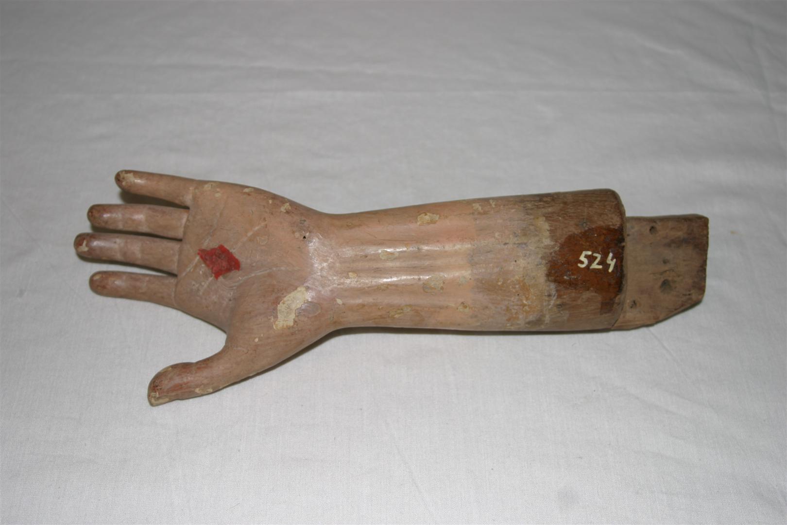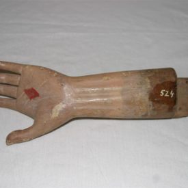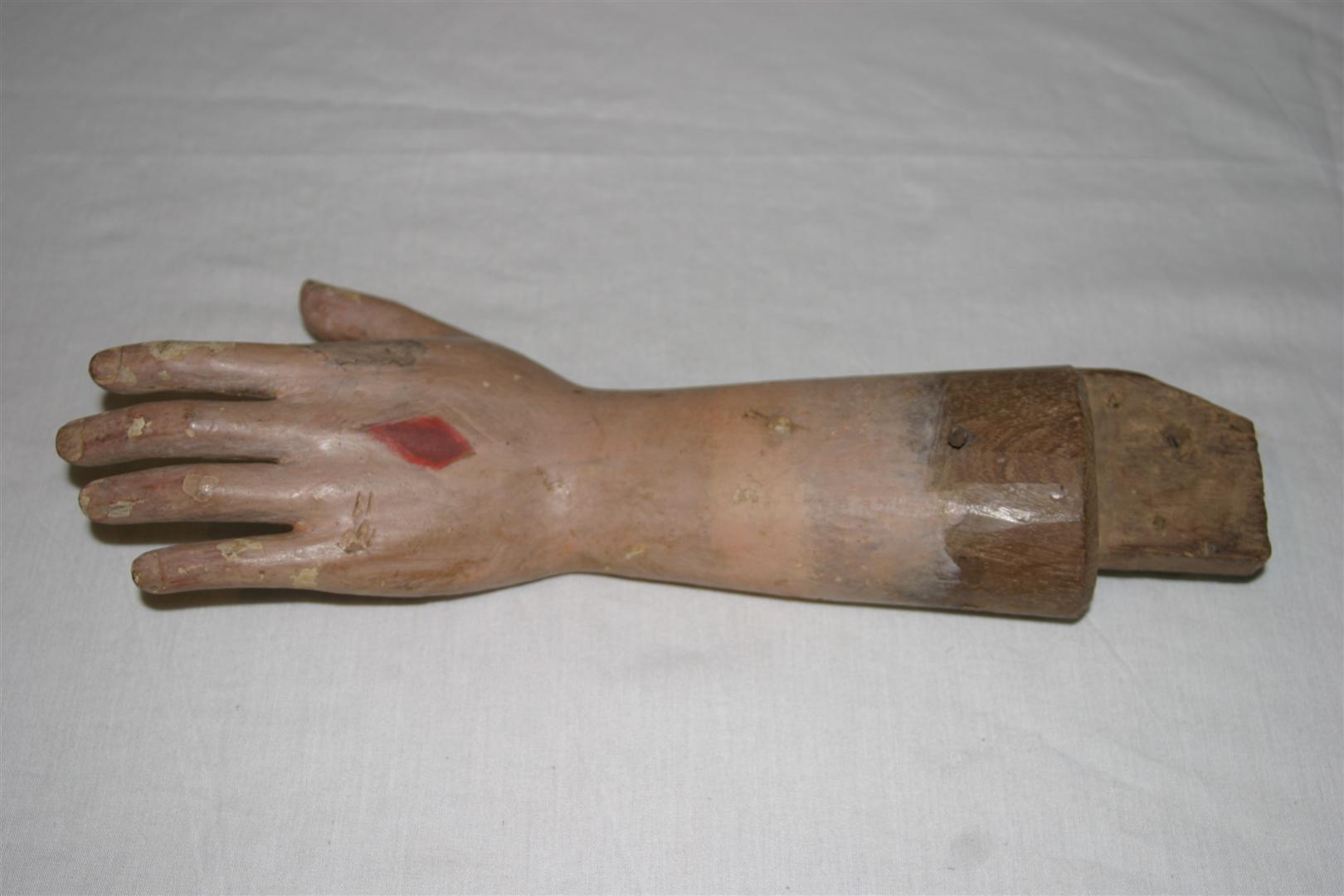 Antebraço e mão de santo de roca (possivelmente São Francisco das Chagas), correspondente ao lado esquerdo, de dimensões médias, confeccionado em madeira (jacarandá mineiro) entalhada e pintada. Peça de linhas simples e carnação em tom róseo, tendo, na extremidade inferior, estrutura para encaixe no restante da articulação do braço (este inexistente). Parte interna do pulso com representação de veias em relevo e, na palma da mão, três traços bem marcados, além de chaga (incava) em formato de losango, pintada em tom vermelho. Na parte superior da mão, leve representação dos ossos e chaga no mesmo formato da palma, pintada em tom vermelho. Objeto em posição reta, com leve abaulado na mão, tendo dedos delgados, com separação, e unhas bem delineadas e pintadas em tom rosa. Carnação pintada até metade do antebraço.