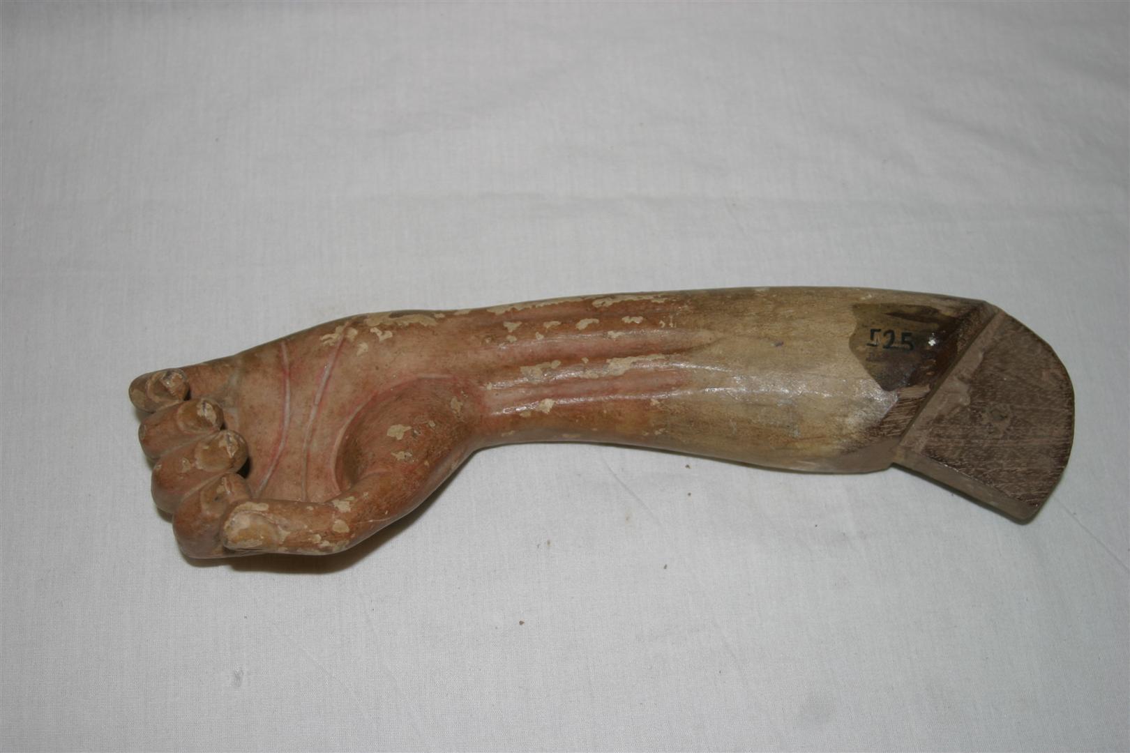 Antebraço e mão de santo de roca, correspondente ao lado esquerdo, de dimensões médias, confeccionado em madeira (jacarandá mineiro) entalhada e policromada. Peça de linhas simples e carnação em tom bege e róseo, tendo, na extremidade inferior, estrutura irregular com orifício para encaixe no restante do braço (este inexistente). Objeto em posição reta, com pulso delgado e mão levemente elevada e voltado para direita, tendo dedos flexionados e voltados para dentro. A ponta do dedo polegar encontra-se encostada na lateral do dedo indicador (possivelmente para segurar atributo). Dedos delgados, com separação e unhas bem delineadas e pintadas em tom bege. Na parte superior da mão, representação de escoriações em tinta vermelha e azul (atualmente esverdeada) e leve representação dos ossos em relevo. Na parte interna do pulso, representação das veias em relevo, e, na palma de mão, três traços bem marcados e contornados por tinta vermelha. Carnação pintada até a metade do antebraço com pequenos rajados em tom vermelho representando ferimentos.