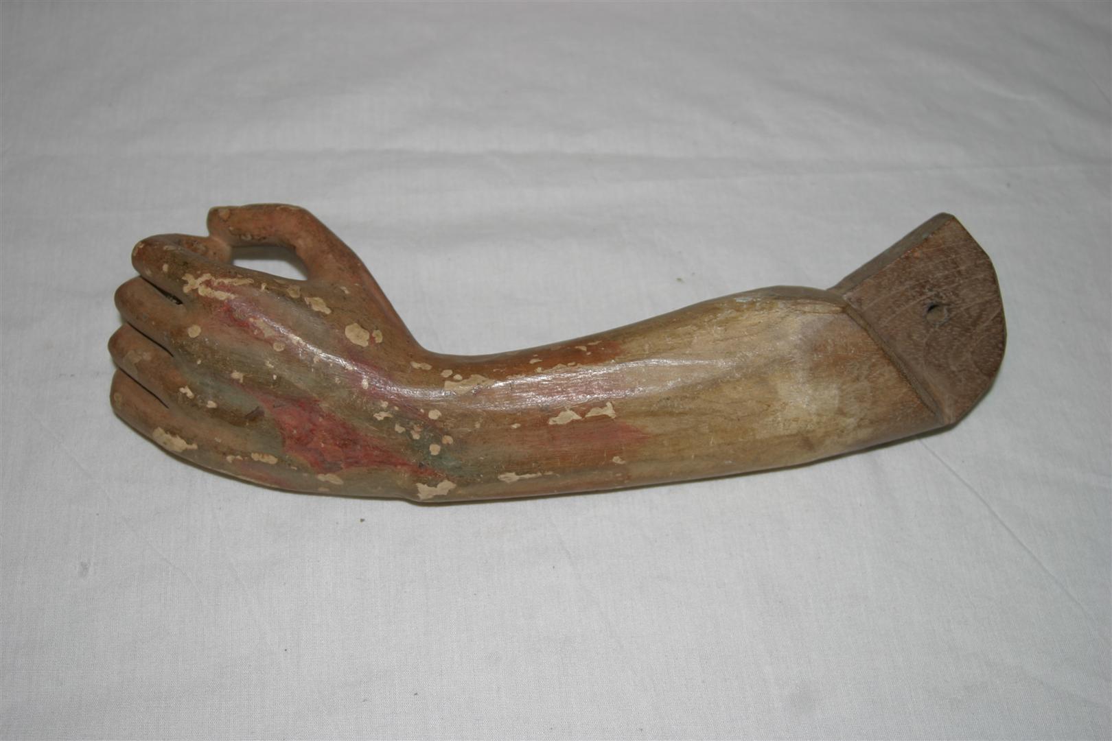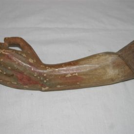 Antebraço e mão de santo de roca, correspondente ao lado esquerdo, de dimensões médias, confeccionado em madeira (jacarandá mineiro) entalhada e policromada. Peça de linhas simples e carnação em tom bege e róseo, tendo, na extremidade inferior, estrutura irregular com orifício para encaixe no restante do braço (este inexistente). Objeto em posição reta, com pulso delgado e mão levemente elevada e voltado para direita, tendo dedos flexionados e voltados para dentro. A ponta do dedo polegar encontra-se encostada na lateral do dedo indicador (possivelmente para segurar atributo). Dedos delgados, com separação e unhas bem delineadas e pintadas em tom bege. Na parte superior da mão, representação de escoriações em tinta vermelha e azul (atualmente esverdeada) e leve representação dos ossos em relevo. Na parte interna do pulso, representação das veias em relevo, e, na palma de mão, três traços bem marcados e contornados por tinta vermelha. Carnação pintada até a metade do antebraço com pequenos rajados em tom vermelho representando ferimentos.