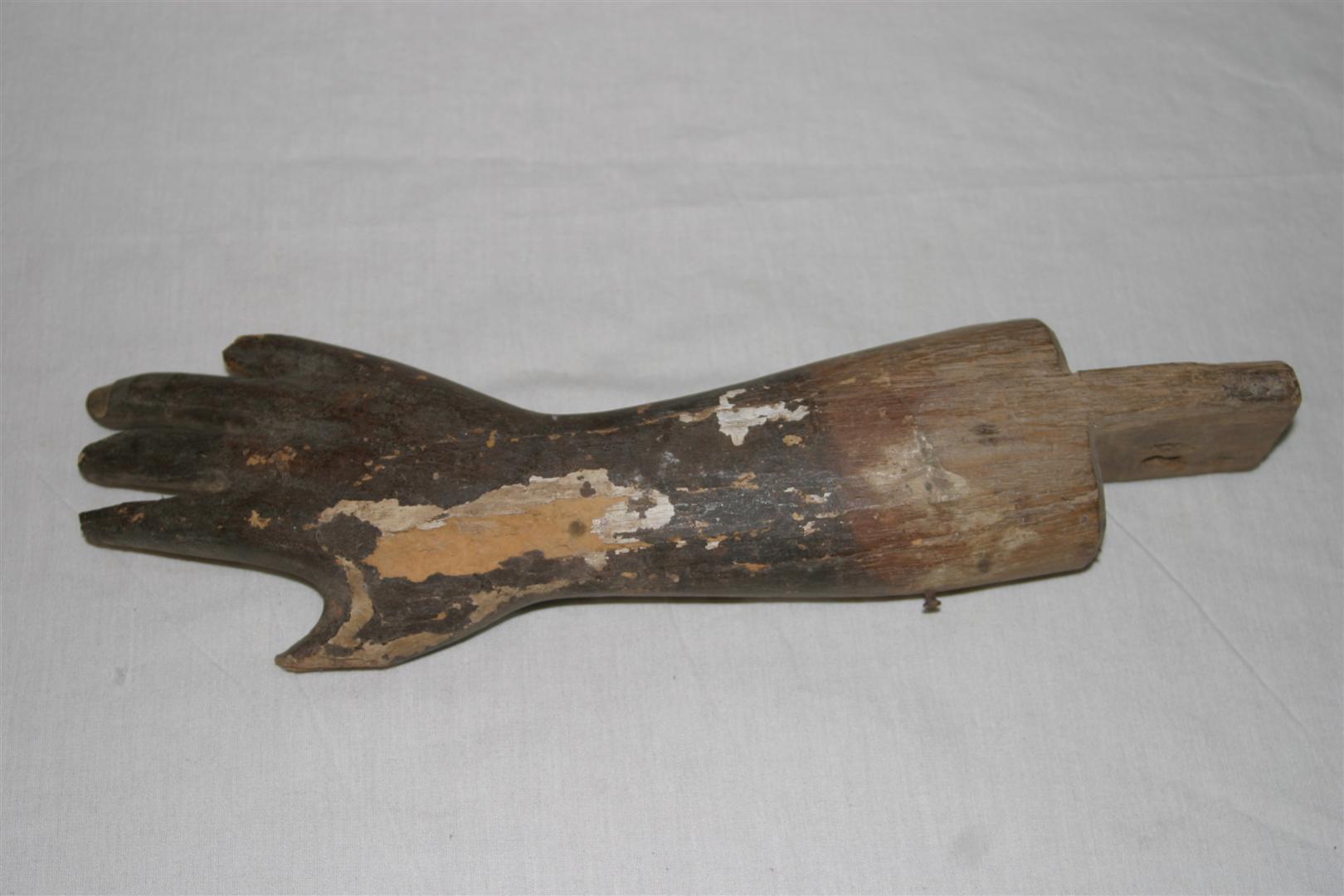 Antebraço e mão de santo de roca, possivelmente São Benedito de Palermo, correspondente ao lado direito, de dimensões médias, confeccionado em madeira (jacarandá mineiro) entalhada e pintada. Peça de linhas simples e carnação em tom marrom escuro, tendo, na extremidade inferior, estrutura retangular com orifícios para encaixe no restante do braço (este inexistente). Objeto em posição reta, com pulso delgado e mão com leve inclinação à direita. Apresenta separação entre os dedos e dedo anular em pequena curvatura, com unha bem delineada e pintada em tom bege (restante dos dedos quebrados). Dedo polegar afastado. Parte superior da mão com leve representação dos ossos em relevo e palma lisa. Carnação pintada até a metade do antebraço.