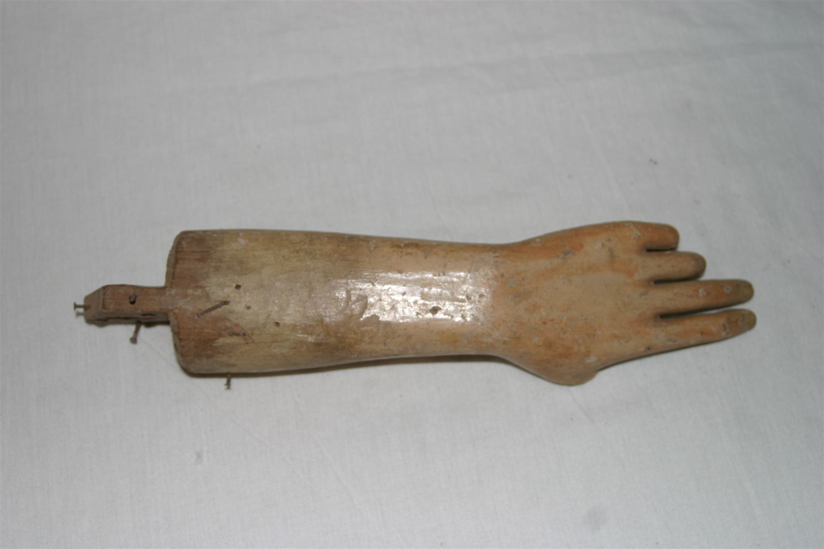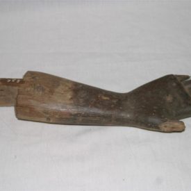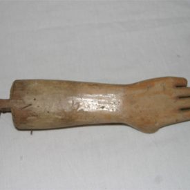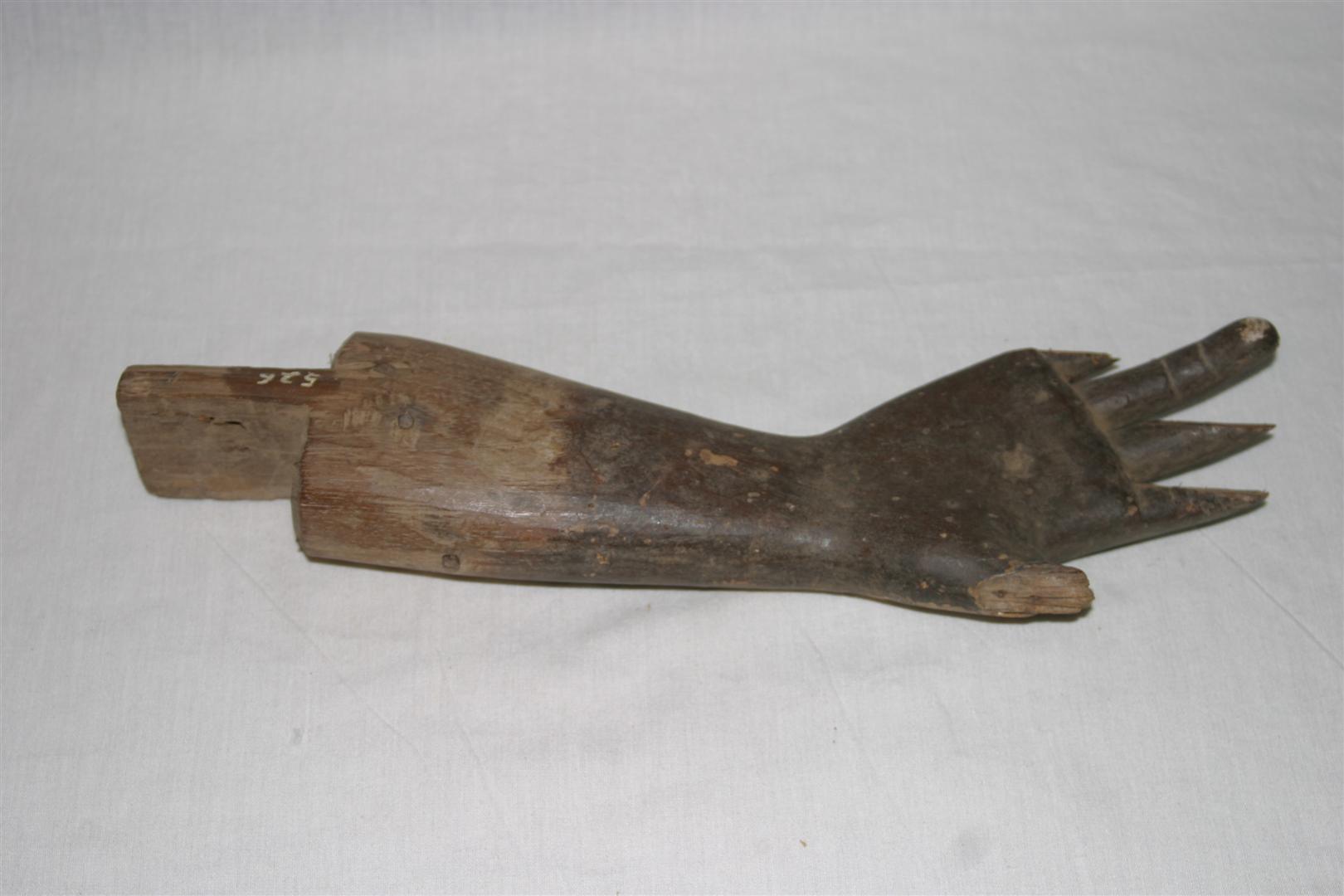 Antebraço e mão de santo de roca, possivelmente São Benedito de Palermo, correspondente ao lado direito, de dimensões médias, confeccionado em madeira (jacarandá mineiro) entalhada e pintada. Peça de linhas simples e carnação em tom marrom escuro, tendo, na extremidade inferior, estrutura retangular com orifícios para encaixe no restante do braço (este inexistente). Objeto em posição reta, com pulso delgado e mão com leve inclinação à direita. Apresenta separação entre os dedos e dedo anular em pequena curvatura, com unha bem delineada e pintada em tom bege (restante dos dedos quebrados). Dedo polegar afastado. Parte superior da mão com leve representação dos ossos em relevo e palma lisa. Carnação pintada até a metade do antebraço.
